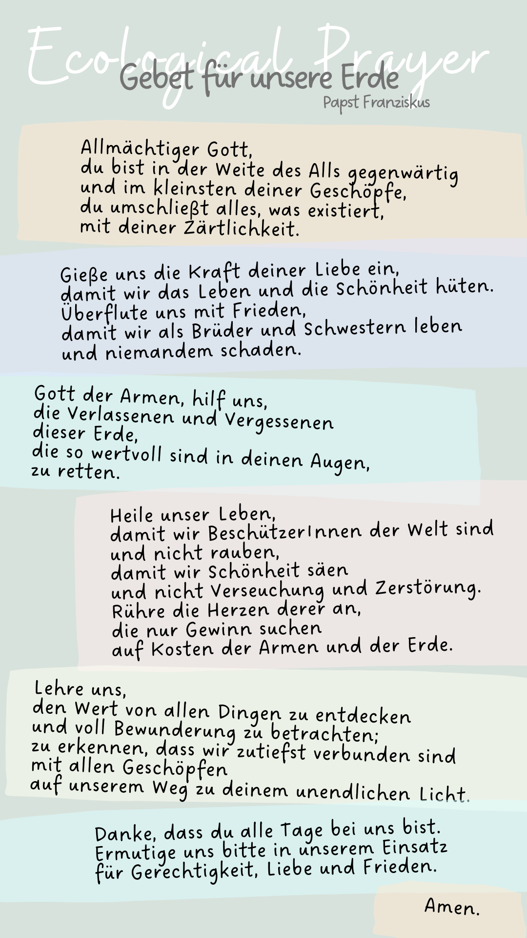 Papst Franziskus lädt uns in der Enzyklika "Laudato si‘ " ein, unsere Beziehung zu Gott, zur Schöpfung und zueinander in Einklang zu bringen. In der Reihe „Ecological Prayer“ wollen wir Impulse dazu vorschlagen.