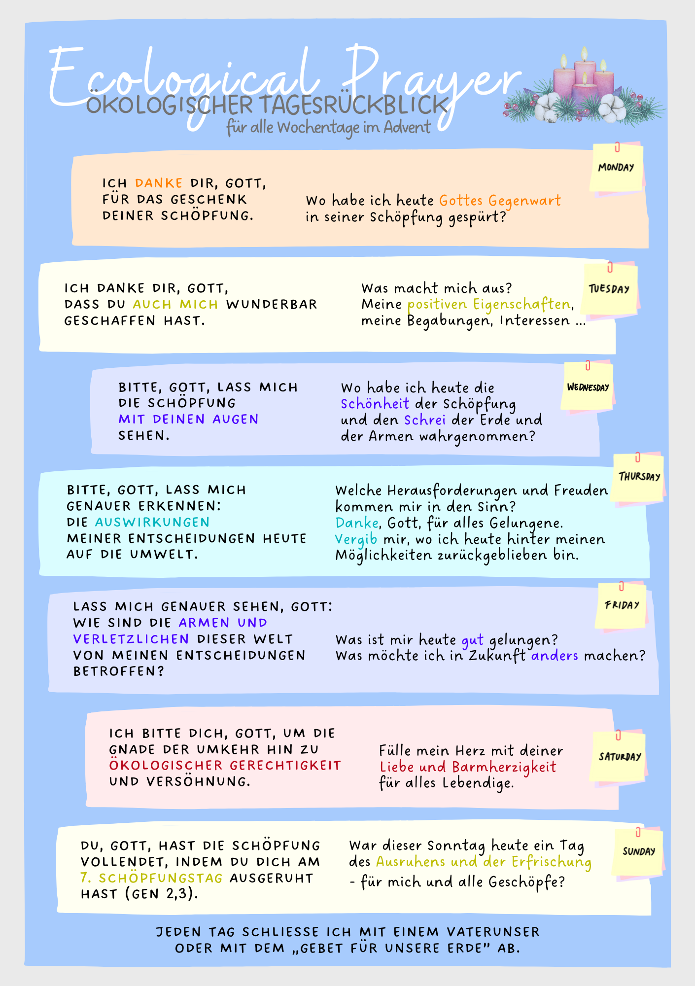Jeden Tag der Woche lädt ein kurzer Text ein, den Tag Revue passieren zu lassen. Man schließt das Gebet jeweils mit einem Vaterunser oder dem "Gebet für unsere Erde" (Papst Franziskus) ab. Dafür braucht es nicht mehr als 10 Minuten täglich.