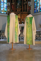 In einem zweiten Schritt wählte Sr. Imelda Ruf aus diesem Stoff für jedes Teil jene Ausschnitte, die zu den entsprechenden Gewändern und Teilen am besten passen. So entstand das Grüne Ornat.