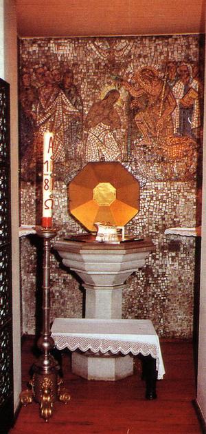 Auch das Mosaik in der Taufkapelle (hier wurde vom Künstler P. Franz Sauer verewigt) ist ein Werk von Prof. Tahedl.