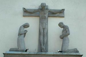 Die überlebensgroße Kreuzigungsgruppe über dem Haupteingang der Kirche ist ein Werk von Dipl.-Ing. Weinberger.