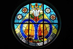 Die runden Fenster neben dem Haupteingang sind eine Arbeit des Glasmalers Franz Götzer und wurden von der Familie Wallisch-Hecht und den Schwestern M. und Th. Soukup gespendet.