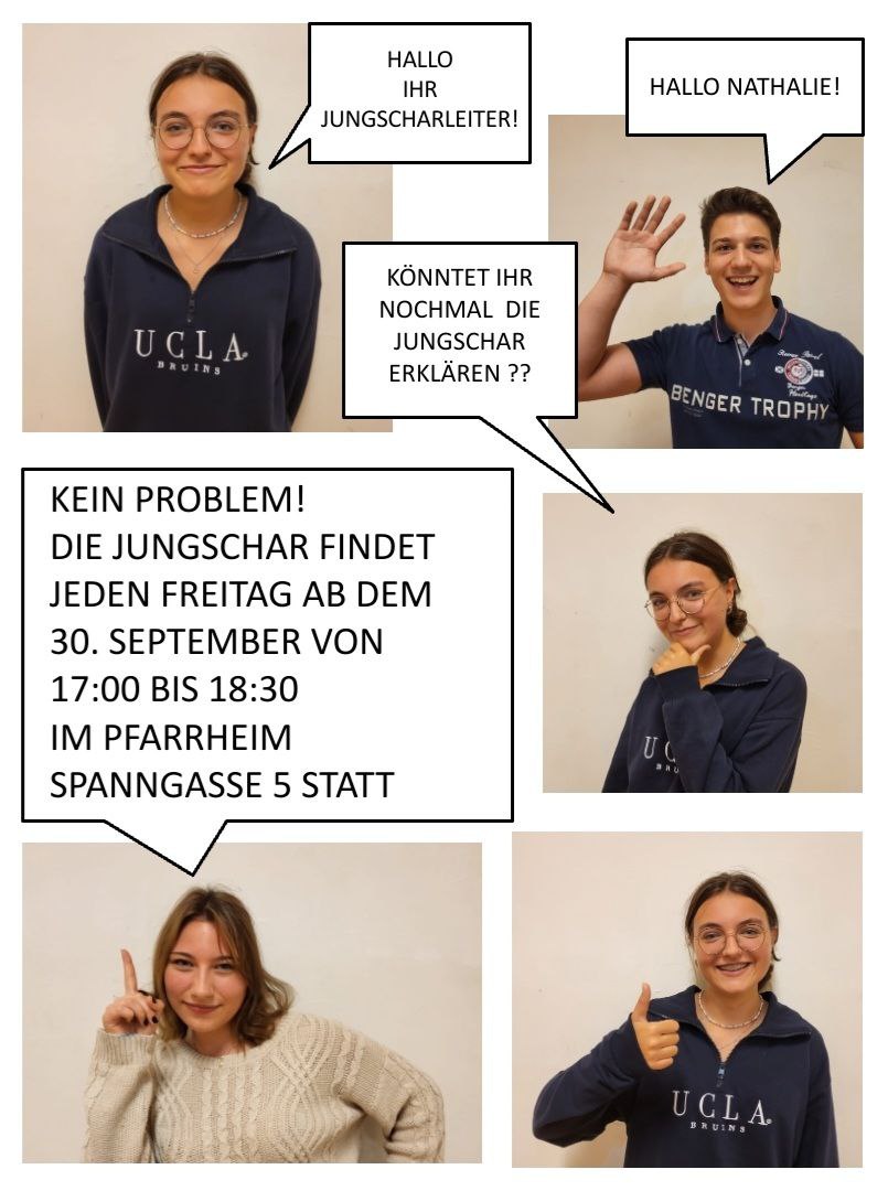 "Hallo, wir sind die Jungschar Bruckhaufen. Bei uns könnt ihr Spiele spielen, basteln, Ausflüge unternehmen, Freunde treffen und vieles mehr. Wir würden uns freuen, wenn ihr einmal am Freitag von 17:00 bis 18:30 bei uns im Pfarrheim (Spanngasse 5) vorbeischaut."