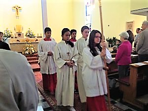 Unsere kleine, aber feine Ministrantenschar nimmt eine wichtige Aufgabe wahr: Als Stellvertreter der Gemeinde tragen die Kinder Brot und Wein zum Altar, reichen dem Priester Wasser und Handtuch und erinnern uns mit ihren Kerzenleuchtern daran, dass Christus das Licht der Welt ist.