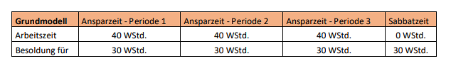 In der Ansparzeit wird das Bruttogehalt (bezogen auf das Wochenstundenausmaß) so weit reduziert, dass der Gehaltsanspruch für die Sabbatzeit (im gleichen Wochenstundenausmaß wie in der Ansparzeit) erarbeitet wird. Für die Berechnung einer Sabbatzeit-Vereinbarung werden immer nur ganze Monate herangezogen: d.h. die Anspar- und Sabbatzeit müssen immer an einem Monatsersten Beginnen bzw. an einem Monatsletzten enden.