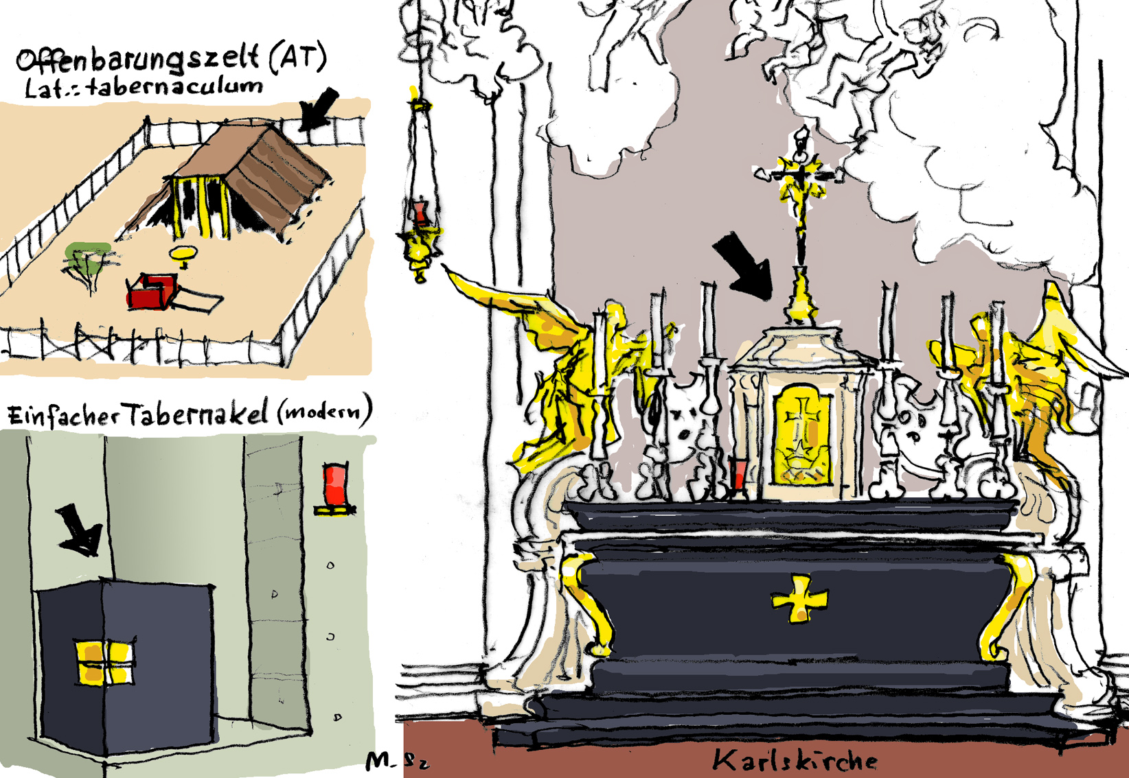 Daraus entwickelte sich der Tabernakel. Tabernaculum heißt auf Lateinisch „Zelt“ und erinnert an das Zelt der Bundeslade – Zeichen des Bundes zwischen Gott und den Menschen. In vielen Tabernakeln bildet ein Stoff in der liturgischen Farbe tatsächlich ein kleines Zelt, in dem Christus „wohnt“.