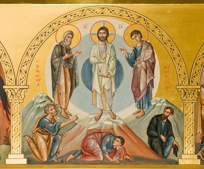 Sechs Tage danach nahm Jesus Petrus, Jakobus und dessen Bruder Johannes beiseite und führte sie auf einen hohen Berg. Und er wurde vor ihren Augen verwandelt; sein Gesicht leuchtete wie die Sonne und seine Kleider wurden blendend weiß wie das Licht. Da erschienen plötzlich vor ihren Augen Mose und Elija und redeten mit Jesus.