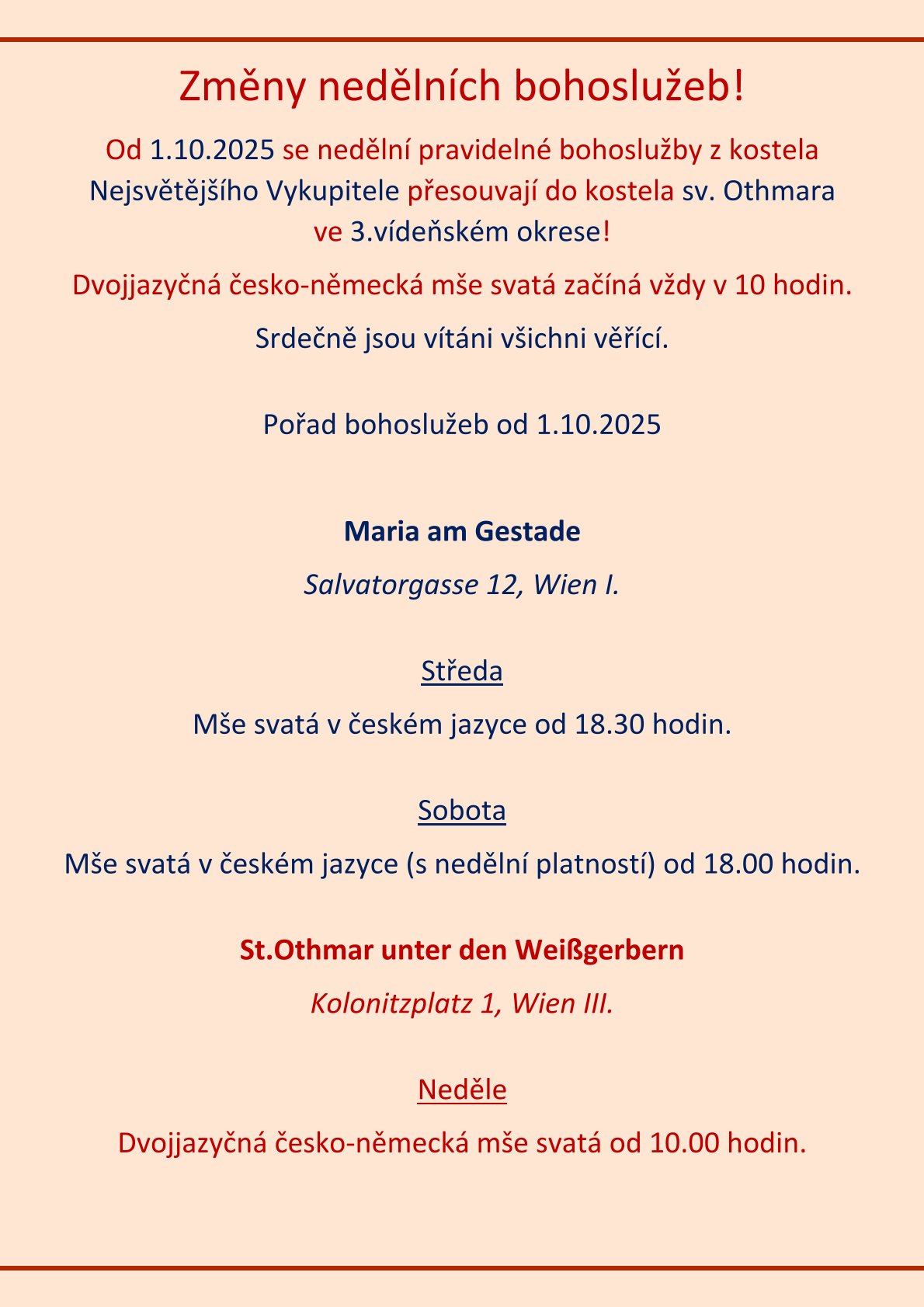 Změna místa nedělní bohoslužby od 1.10.2025