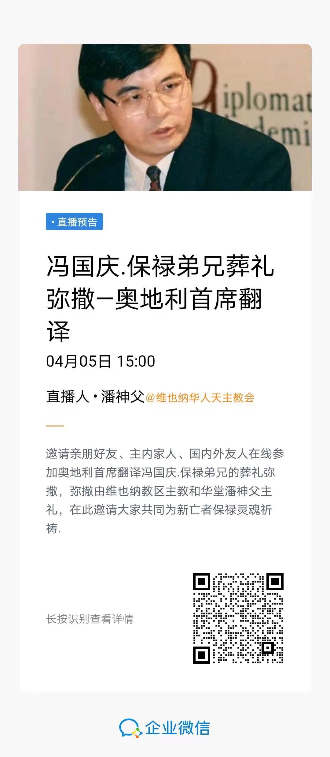 冯国庆博士的追思弥撒定于4月5日下午15:00点举行。