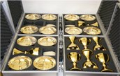 Zur Verfügung stehen insgesamt 18 Hostienschalen (Höhe: 7 cm; Durchmesser: 14 cm, Fassungsvermögen: ca. 120 Hostien) samt Plexiglasdeckel mit Sektionsöffnung; 1 Hostienschale samt Plexiglasdeckel (für Hostien im Durchmesser bis 20 cm) und 12 Kelche (Höhe: 17 cm, Durchmesser und Cupa: 10 cm, Fassungsvermögen: max. 0,3 l.