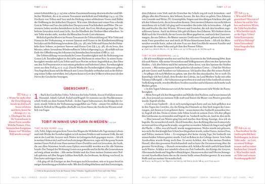 Zu jedem biblischen Buch gibt es eine Einführung und in den Fußnoten werden einzelne biblische Begriffe erklärt. Auch eine Orientierungshilfe anhand der großen Themen ist hier gegeben. Nicht in Form von Icons, wie in der Einblickbibel, sondern Dank einer „Zierzeile“ auf jeder Seite mit den wichtigsten thematischen Stichwörtern des jeweiligen Buches: Heilen, Weg, Volk, Barmherzigkeit, Segen, Mut und viele weitere.