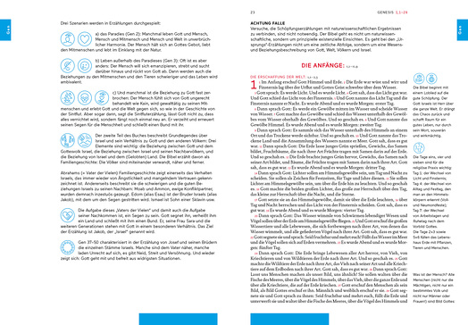 Für jedes biblische Buch gibt es eine Einleitung, in welcher der Aufbau, der Inhalt und die wichtigsten Themen übersichtlich dargestellt sind – auch hier findet man die Icons wieder. Unter der Überschrift „Achtung Falle“ finden sich gegebenenfalls Erklärungen, wie man einen Text NICHT verstehen sollte. Für ungeübte Leser eine wichtige Hilfe, um nicht in falsche Gottesbilder zu fallen und zu glauben, dass der biblische Gott z.B. ein Gott ist, der Eroberungskriege möchte.