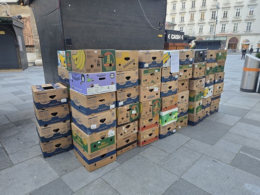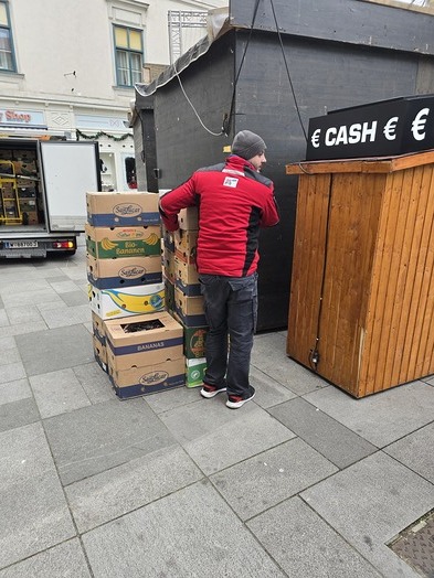 Um 7 Uhr in der Früh brachten Leo Führer von unserem Brillenapostolat und Markus Heimel von der Wirtschaftsstelle 100 (!) Bananenschachteln aus dem Archiv auf den Stephansplatz, jede Kiste war rund 10 kg schwer. Erst am vergangenen Montag ist per Post die 200.000ste Brille ins Haus gekommen.