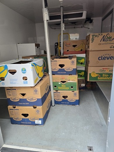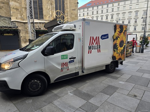 Nach seiner Lieferrunde kam ein geleerter Kühltransporter der Firma Müller Transporte hin. Die Schachteln waren schnell eingeladen, und um 9 Uhr verließ der Klein-LKW wieder die Innenstadt. Die Brillen werden in einem Logostikzentrum auf Paletten in Fern-LKWs verladen und an ihr erstes Ziel gebracht, an die Verteilstelle in Deutschland.