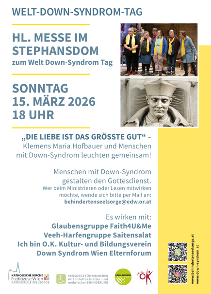 Auch heuer feiern wir – zum sechzehnten Mal – den Gottesdienst anlässlich des Welt-Down-Syndrom-Tages und laden Sie herzlich dazu ein. Im Anhang befindet sich das Plakat mit allen näheren Informationen. Die Hl. Messe wird von der Seelsorge für Menschen mit intellektueller und mehrfacher Behinderung der Erzdiözese Wien vorbereitet, in Zusammenarbeit mit dem Down-Syndrom Eltern Forum Wien und dem Kultur- und Bildungsverein Ich bin O.K. Herzlich willkommen!