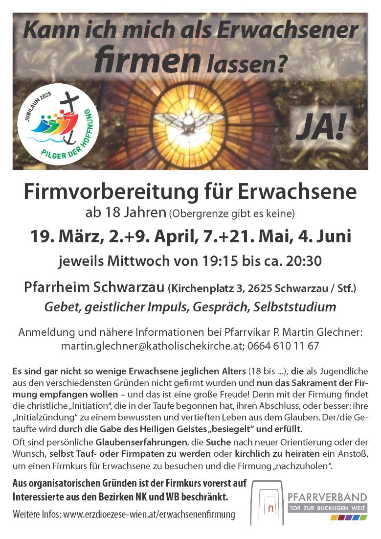 Im Jahr 2025 gab es den ersten Firmkurs für Erwachsene in der Pfarre Schwarzau, für 2026 können sich Interessierte direkt in der Pfarre melden (Kontaktdaten am Plakat bzw. Link ganz unten).