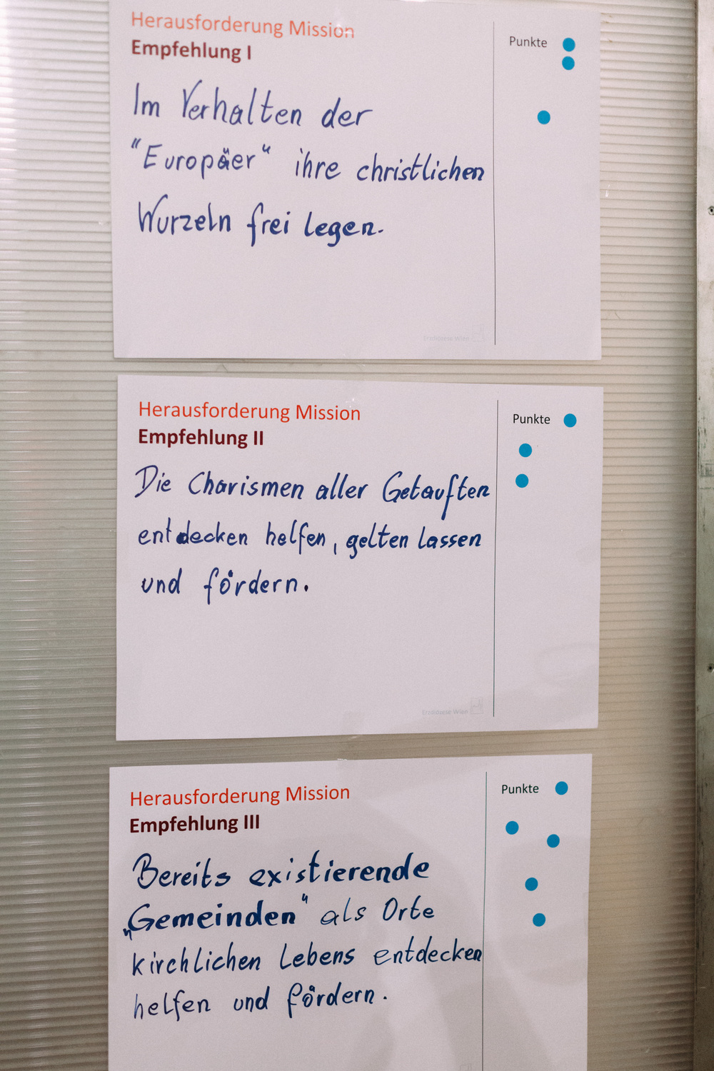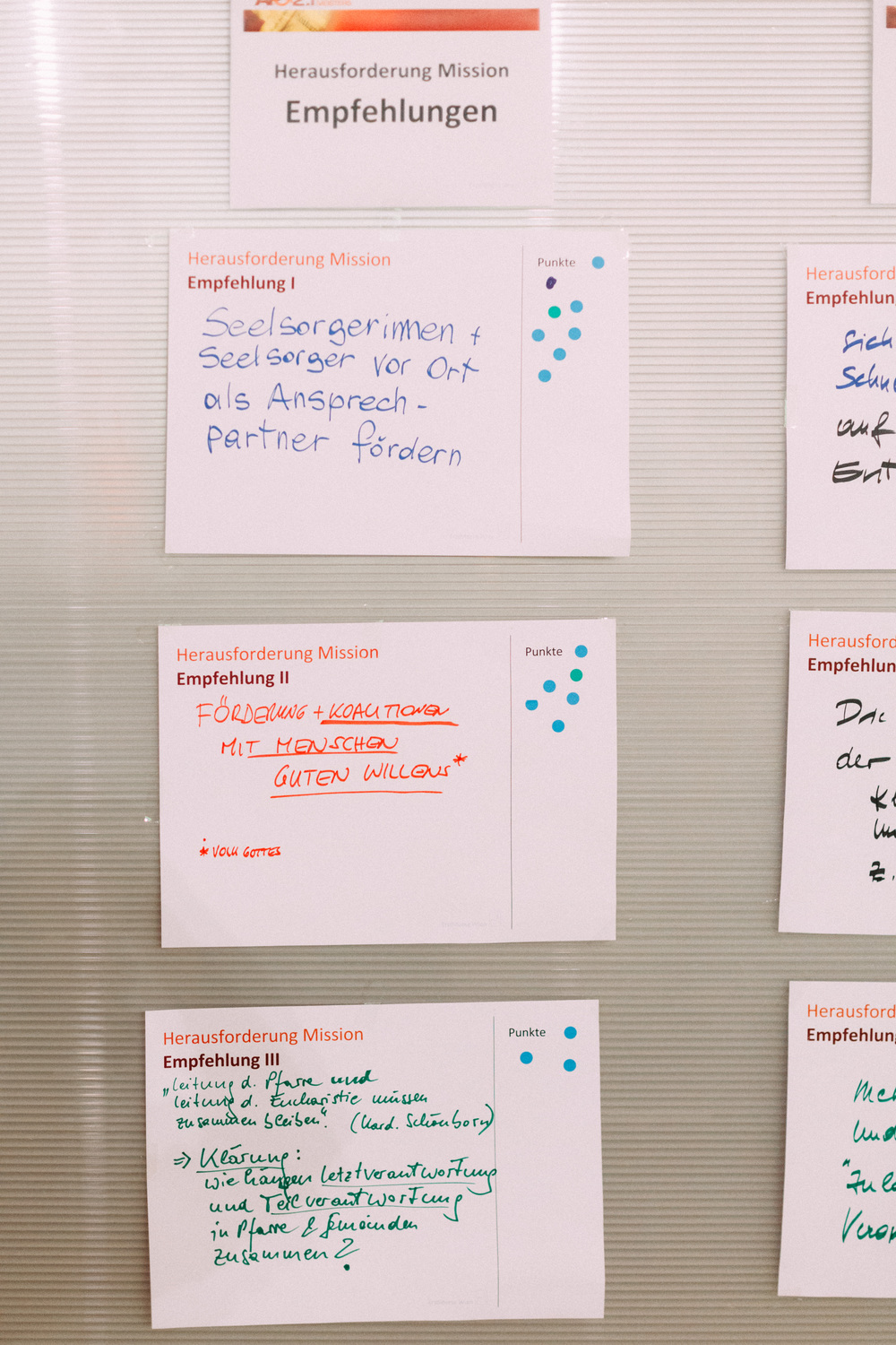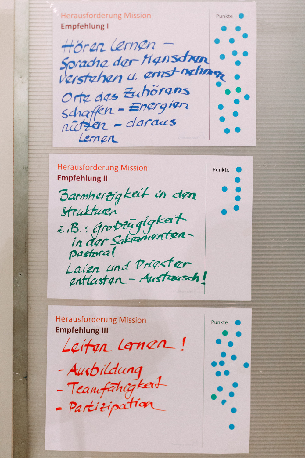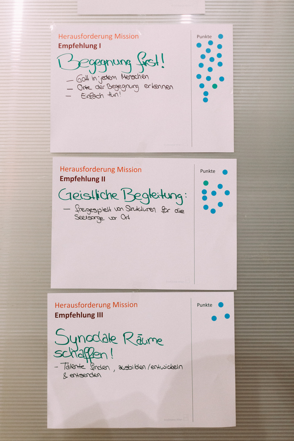 Die Teilnehmerinnen und Teilnehmer am Tag der Räte haben dem Erzbischof und der Steuerungsgruppe des Diözesanprozesses ihre Empfehlungen zu den Themen "Jüngerschaft" und "Mission" festgehalten. Im November wird der Erzbischof den neu errichteten Entwicklungsräumen einen konkreten Auftrag geben gemäß der Frage: "Wie geschieht in diesem Gebiet Mission?"