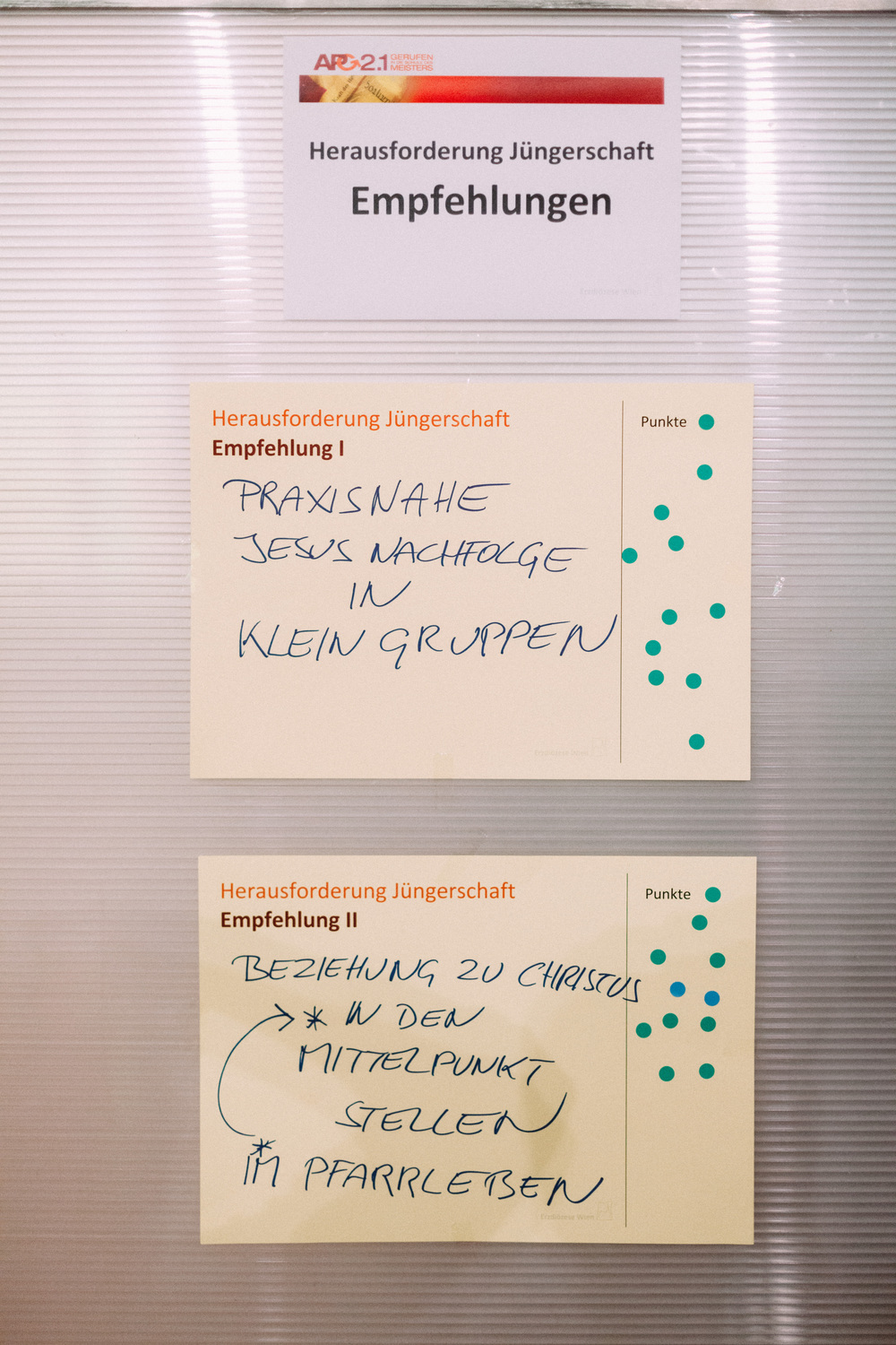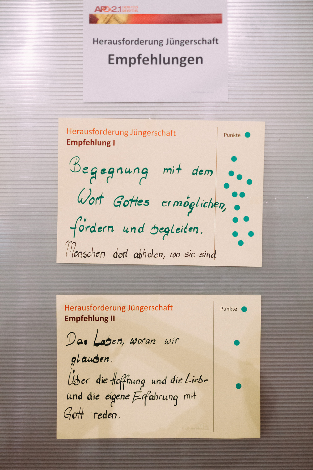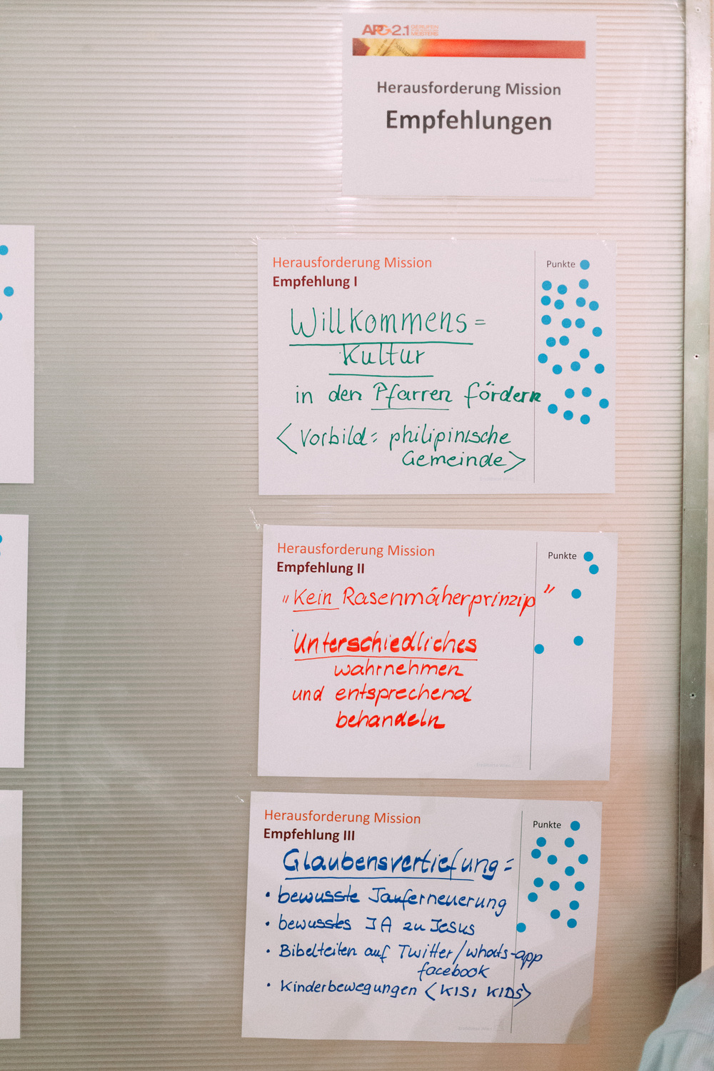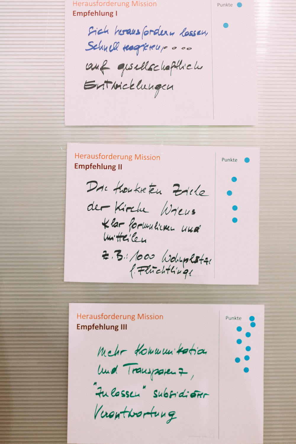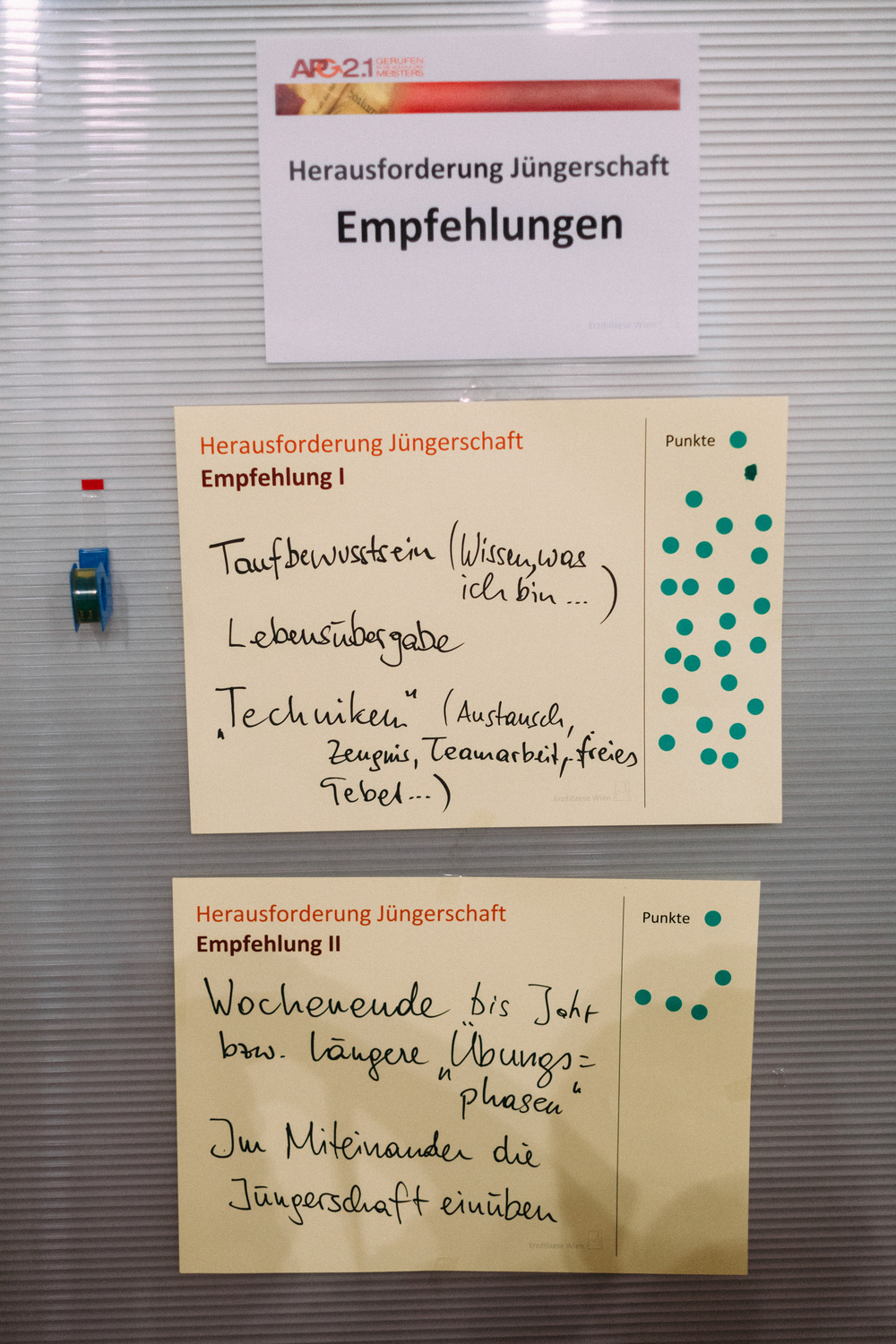 Die Teilnehmerinnen und Teilnehmer am Tag der Räte haben dem Erzbischof und der Steuerungsgruppe des Diözesanprozesses ihre Empfehlungen zu den Themen "Jüngerschaft" und "Mission" festgehalten. Im November wird der Erzbischof den neu errichteten Entwicklungsräumen einen konkreten Auftrag geben gemäß der Frage: "Wie geschieht in diesem Gebiet Mission?"