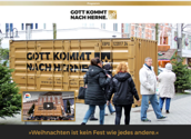 Eine deutsche Pfarre hatte die Idee einen Container mit der Aufschrift "Gott kommt nach Herne" in der Einkaufsstraße der Stadt aufzustellen, um so den Menschen die Botschaft von der Menschwerdung Christi nahe zu bringen.