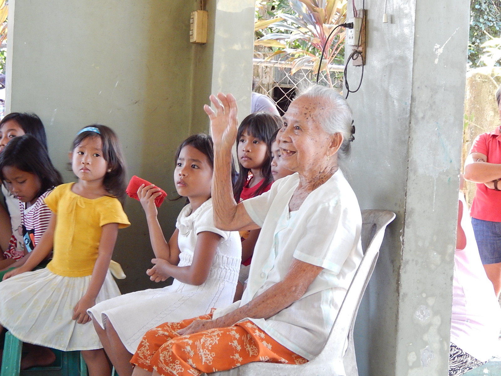 Am Ende unseres Besuchs begegne ich der mit 94 Jahren ältesten anwesenden Dorfbewohnerin. Mit ihrem für philippinische Verhältnisse extrem hohen Alter wirkt sie fröhlich und zufrieden. Eingebunden in die Dorfgemeinschaft, umgeben von vielen Kindern und offensichtlich auch körperlich noch ziemlich rüstig hat sie anscheinend alles, was sie braucht. Ihre Zufriedenheit kommt auch in ihren Worten und Gesten mir gegenüber zum Ausdruck – und nie fehlt bei ihr der Nachsatz: „Thanks to the grace of God!“
