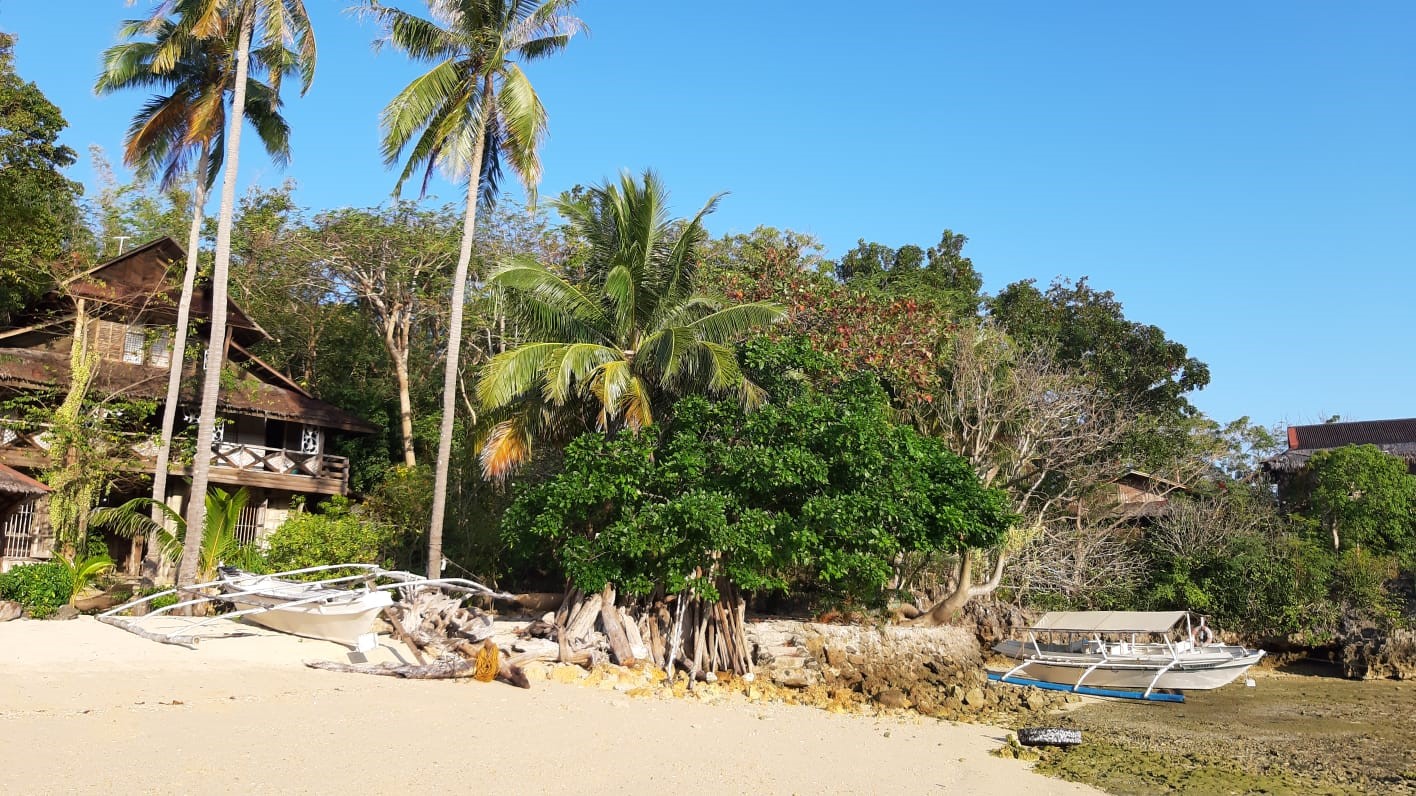 Vom Boot aus betreten wir über einen Steg aus Bambus die Insel und gelangen über einen schmalen Weg zu unseren Unterkünften – kleinen Holzhütten. Man spürt in dieser Anlage, dass alles mit sehr viel Liebe zum Detail errichtet wurde. In jeder Stufe einer Treppe kann man verschiedene Motive, die aus Muscheln eingearbeitet worden sind, entdecken. Einmal sind es Schmetterlinge, dann wieder Muster und Formen, gelegt aus hunderten von kleinsten Muscheln. An den Balken der Hütten hängen Wurzeln, in denen man die Gestalt von Tieren erkennen kann, riesige Muscheln fügen sich wie selbstverständlich in die Landschaft.
