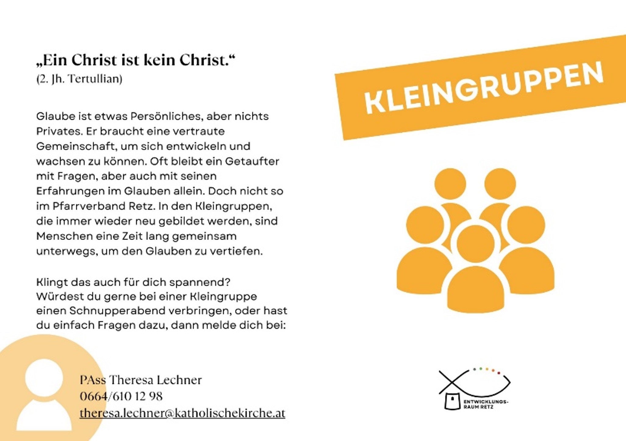 Theresa Lechner, Pfarrverband Retz, 0664/610 12 98, theresa.lechner@katholischekirche.at