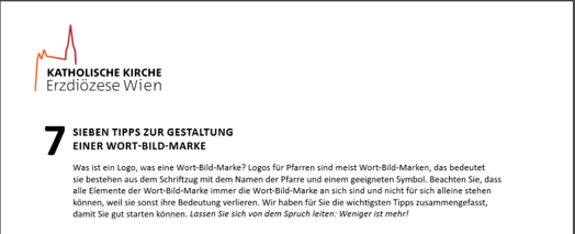 Wenn am Ende dieses Prozesses eine Wort-Bild-Marke entstanden ist, freuen Sie sich. Seien Sie stolz auf sich, denn es ist Ihnen gelungen, ein Symbol zu entwerfen, das viele mittragen können, das nach innen den Zusammenhalt stärkt und nach außen Ihre Pfarre repräsentiert. |