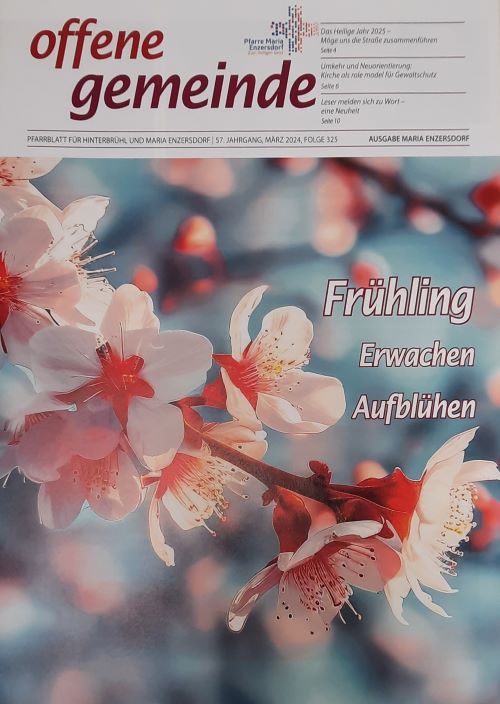Die Pfarren Maria Enzersdorf und Hinterbrühl im südlichen „Speckgürtel“ Wiens haben einen gemeinsamen Pfarrer und geben seit Jahren ein gemeinsames Pfarrblatt namens „offene gemeinde“ heraus. Vielfältige Themen, kluge Texte, lesefreundliche Optik, vielleicht etwas zu knausrig mit Bildern.
