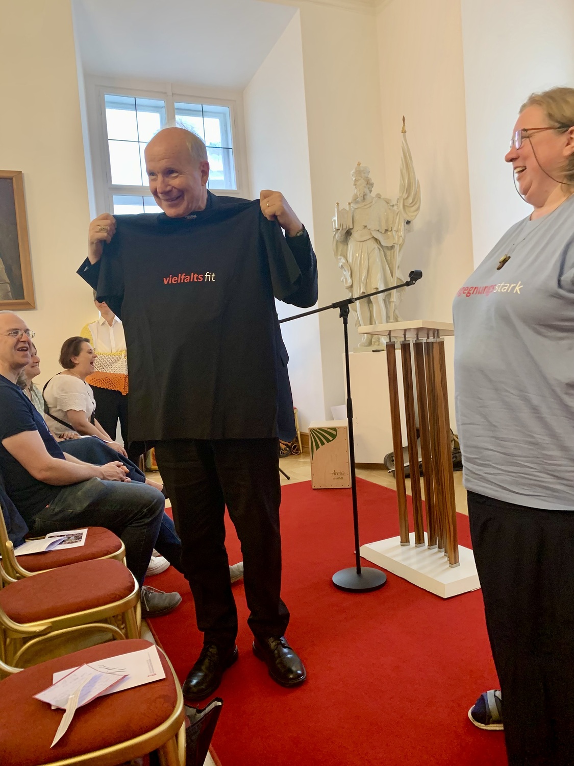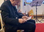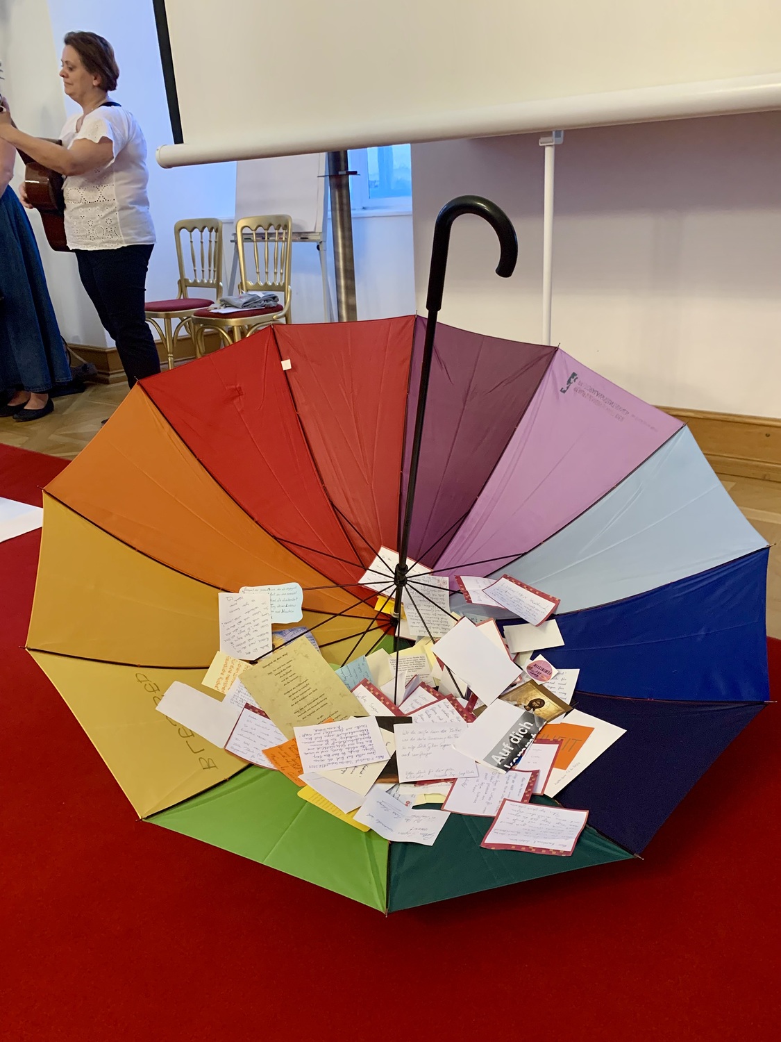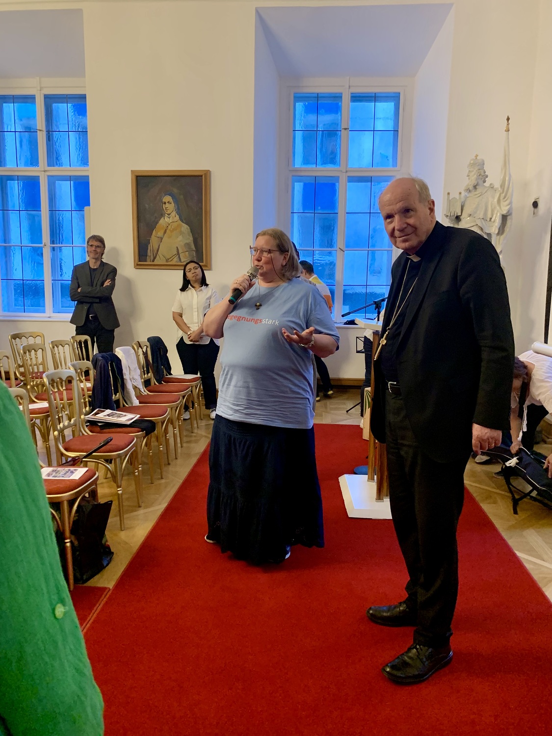 In einem Rückblick von Sonja und Ingrid – was war gelungen, was nicht so schauten wir auf die gemeinsame Zeit mit Kardinal Schönborn zurück. Auch der Kardinal sprach zu uns auf die gemeinsame Zeit aus seiner Sicht. Michaela überreichte Geschenke (Jubiläumswein, T- Shirt und Kalender). Anschließend wurde der Kardinal in einem Segensritual - vorbereitet durch Karin, Beata, Patricia und Michaela mit Segenswünschen in einem bunten Schirm und einer „Segenstraube“ gesegnet.