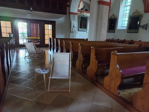 Mit ein wenig Glück landet man auch in einem Kirchstandort, der einen den „Urlaub für die Seele“ mit einem passenden Liegestuhl so richtig gemütlich gestaltet. Mit Psalm 62 sind diese Holzliegestühle bedruckt und erinnern einen beim Erholen daran, dass „bei Gott allein die Seele zur Ruhe kommt.“
