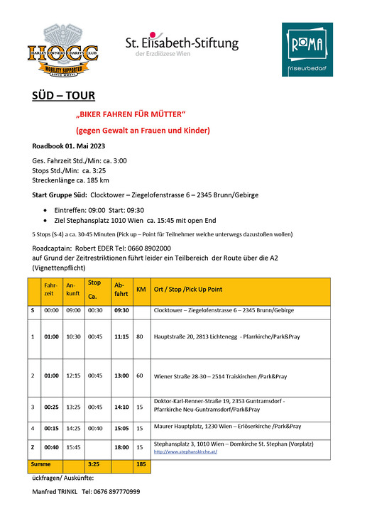 Die drei Routen führen von Park & Pray Standorten unter Leitung des www.HOCC.at bis zum Stephansplatz. Auf der Strecke bieten die Pfarren Segnungen, Maiandachten, Jausen und Blasmusik. Die Charity-Fahrt zugunsten der St. Elisabeth-Stiftung endet mit einer Mottorradsegnung durch Dechant Gerald Gump neben dem Stephansdom.
