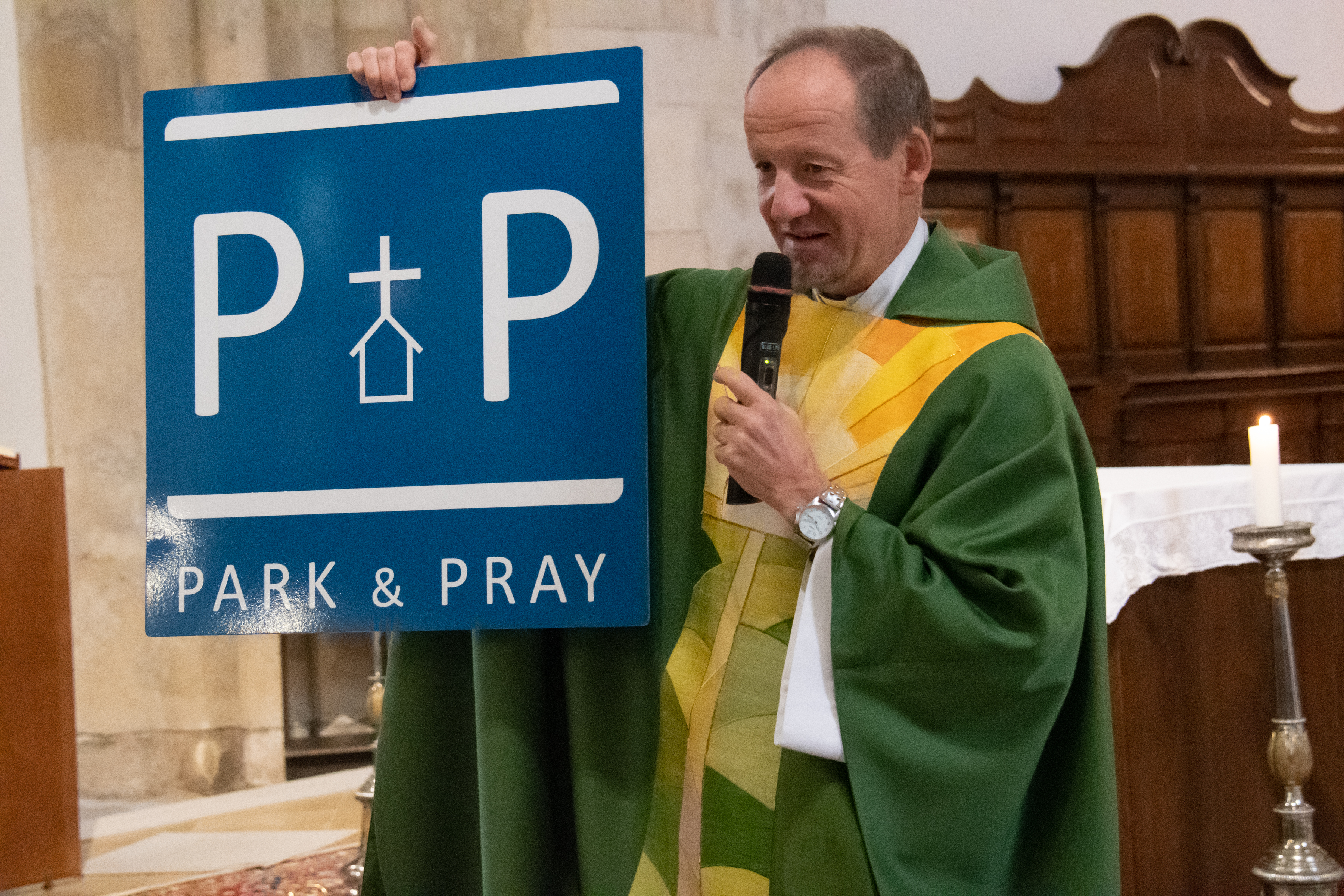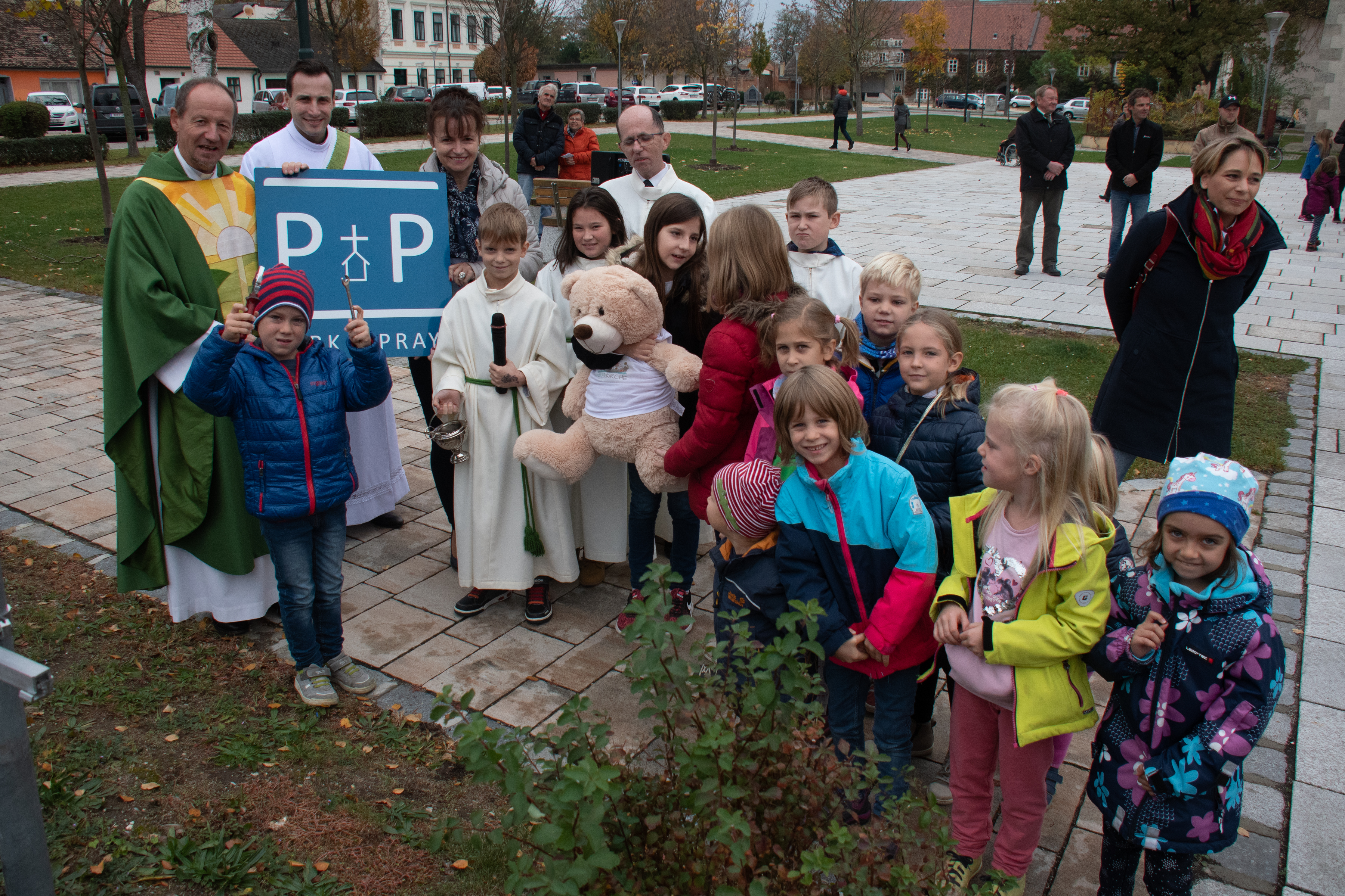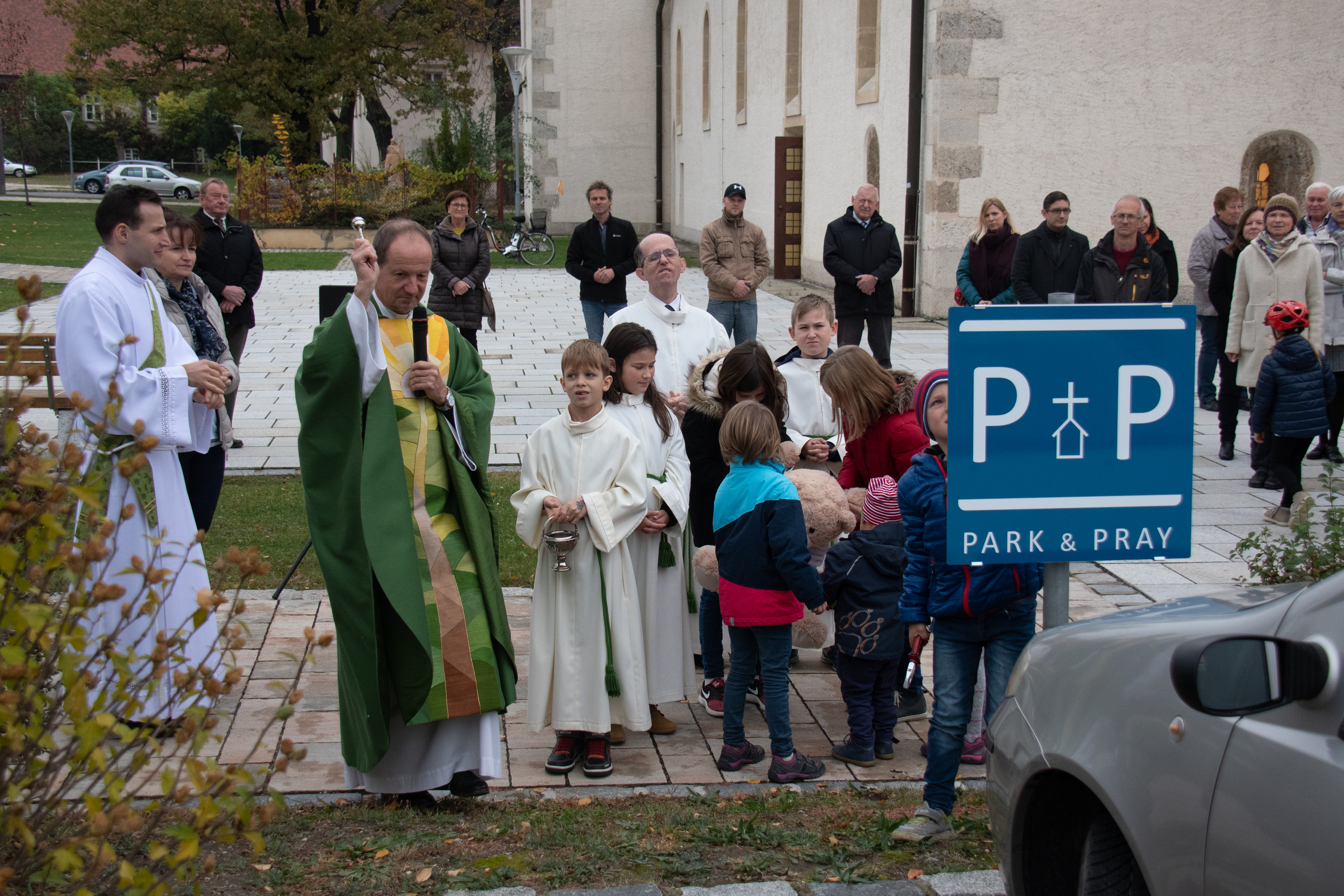 Am 28.10. wurde nach der Familienmesse gemeinsam mit Frau Bürgermeister Brigitte Ribisch feierlich die Tafel mit dem PARK & PRAY – Logo montiert. Danach segnete Pfarrer Christoph den Parkplatz, der ab nun für Leute gewidmet ist, die zum Gebet in die Kirche kommen wollen.