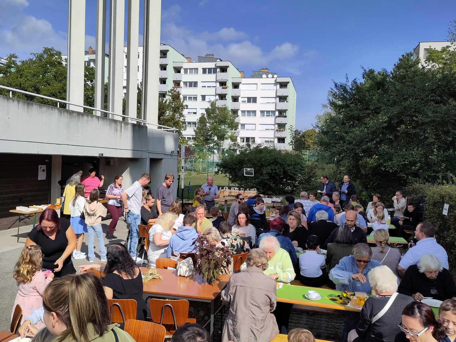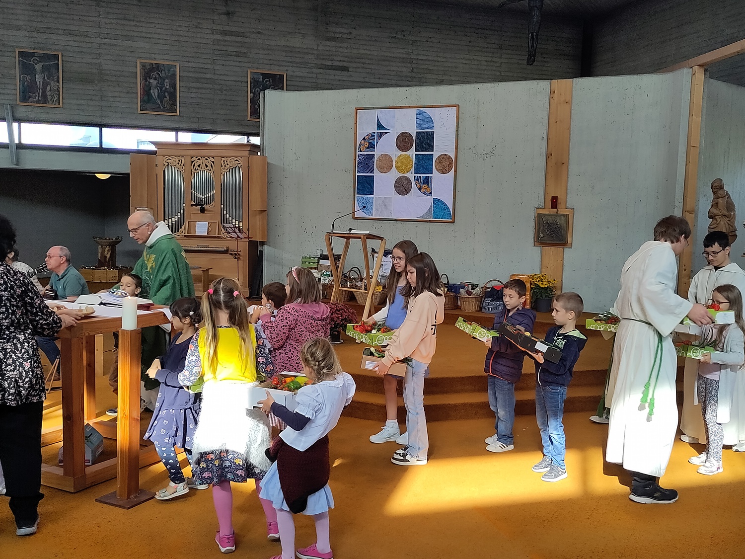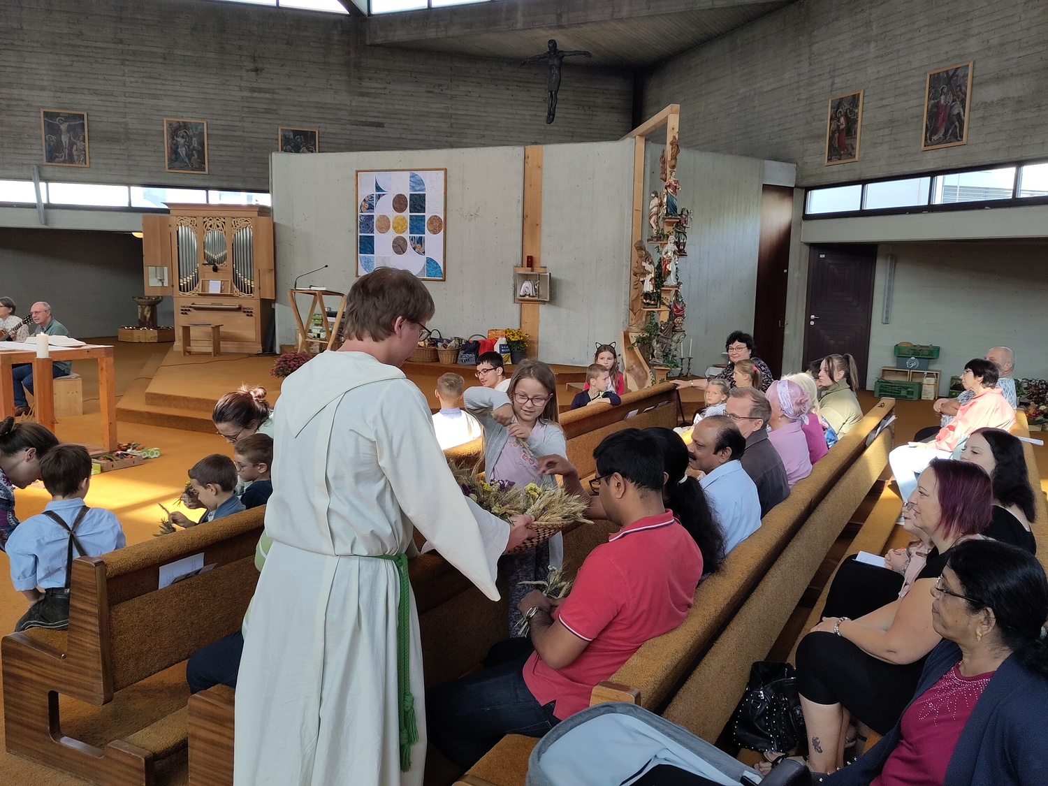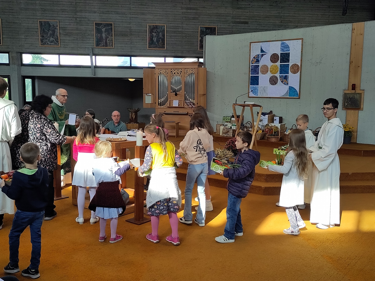 Pfarrer Krexner hat in der Hl. Messe die Kinder gefragt, was sie alles in der Kirche sehen können und wofür wir dankbar sein können. Obst und Gemüse wurde genannt, Freunde, das Wetter,… Wir können Jesus danken, indem wir hilfsbereit sind, anderen eine Freude machen. Ja einige Kinder gaben erstaunliche Antworten!!! Der Gottesdienst wurde musikalisch von Diakon Schalk und seiner Frau vorbereitet und gemeinsam mit Sabine und Vanessa Nowotny, Orgel und Querflöte, begleitet. Auch eine Posaune war dabei. Am Ende wurden alle Mitfeiernden, die Erntegaben und die Erntedankbüscherl gesegnet. Zwei, drei Kinder wollten sogar ganz besonders viel Segen, worauf sie Pfarrer Krexner mit einer Extraportion Weihwasser bedacht hat. Bei der anschließenden Agape gab es Grillwürstel, Salate, Kaffee und Kuchen. Und es sind sehr viele Gottesdienstbesucher zu Speis´ und Trank´ geblieben. Während der Agape fand auch eine Tombola statt, die Peter Kuras wie schon in den vergangenen Jahren geleitet hat. Hilfe hatte er von Glücksengerl Mira. Sie zog die Lose und die Gewinner konnten sich Ihre Kisterl oder Sackerl mit den Erntespenden abholen. Jedes Los hat gewonnen! Dank des schönen Wetters konnten die Kinder auf der Wiese spielen, bei Tisch wurde viel geplaudert und kennengelernt, alle waren gut gelaunt. Der Losverkauf, sowie Spenden für Essen und Getränke erbrachten 1.102,30 Euro, die pfarrlichen Projekten zugute kommen. Ein herzliches Vergelt´s Gott! Ebenfalls zum Erntedankfest führten wir die Caritas Erntedanksammlung für das Le+O Projekt durch. Dabei brachten die Kirchenbesucher insgesamt 244 kg haltbare Lebensmittel zum Altar: Zucker, Mehl, Salz, Öl, Kaffee, Reis, Konserven, Teigwaren, Süßigkeiten, Milch und Getränke. In zwei Autos eingeladen brachten Elisabeth Mroz und Andi Breunhölder die Waren am vergangenen Mittwoch zum Le+O Stützpunkt in die Pfarre Kaiserebersdorf. Wir bedanken uns bei allen, die so eifrig gespendet haben! Herzlichen Dank allen, die zum großartigen Gelingen beigetragen haben!