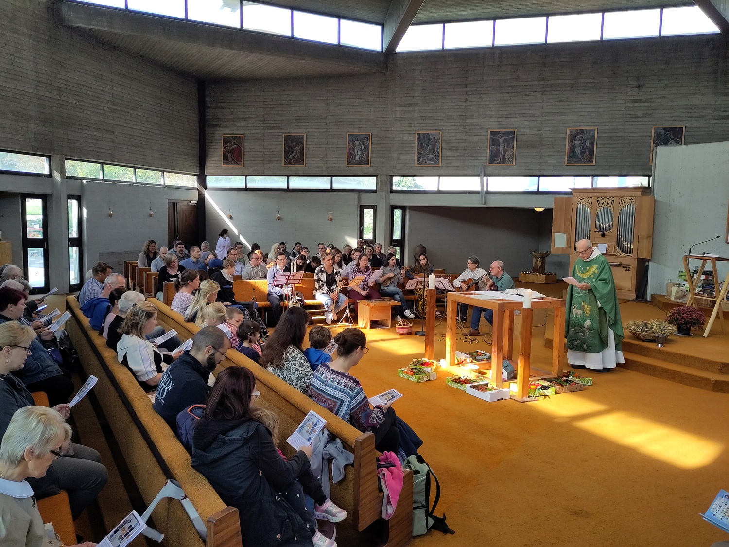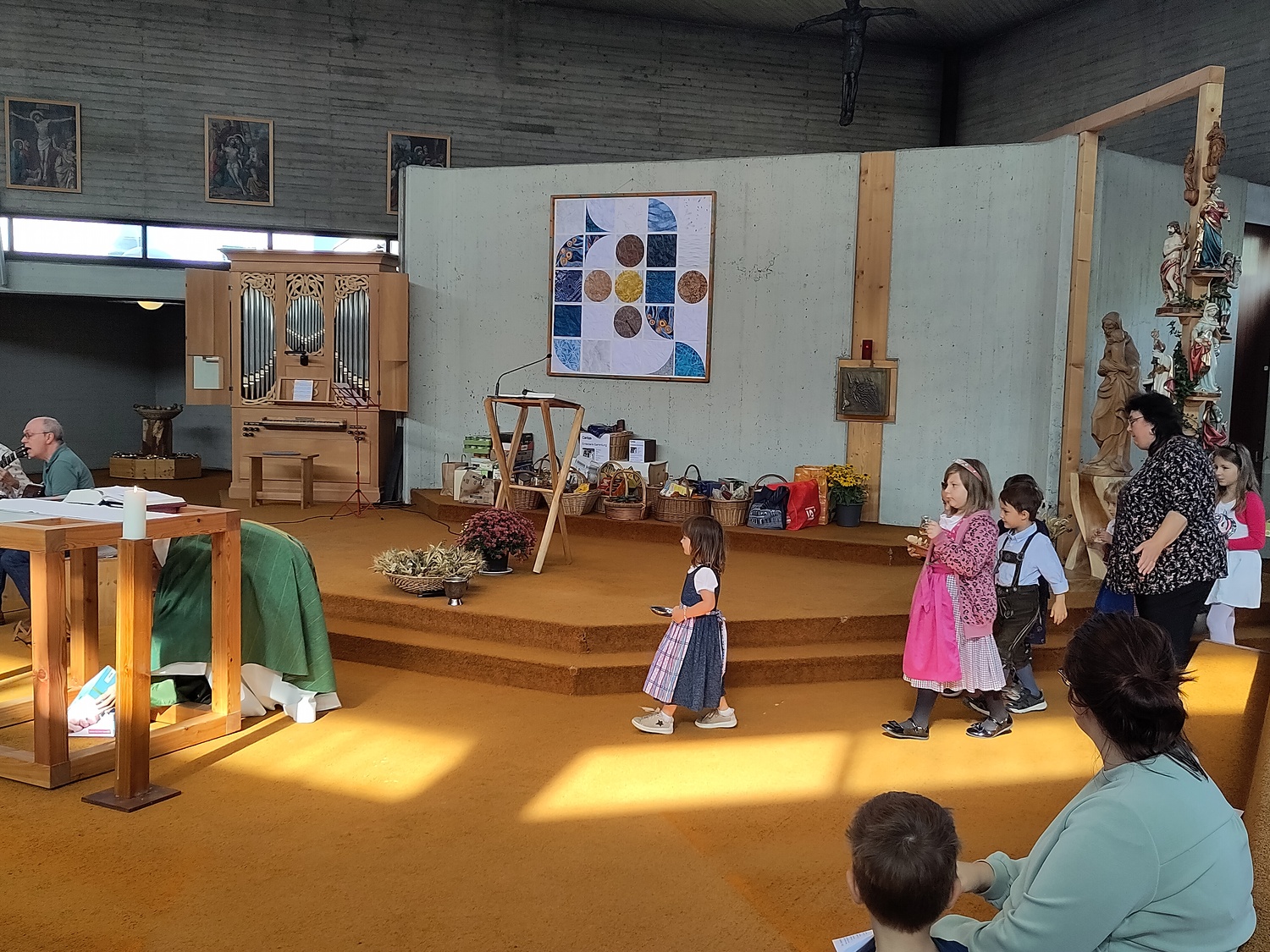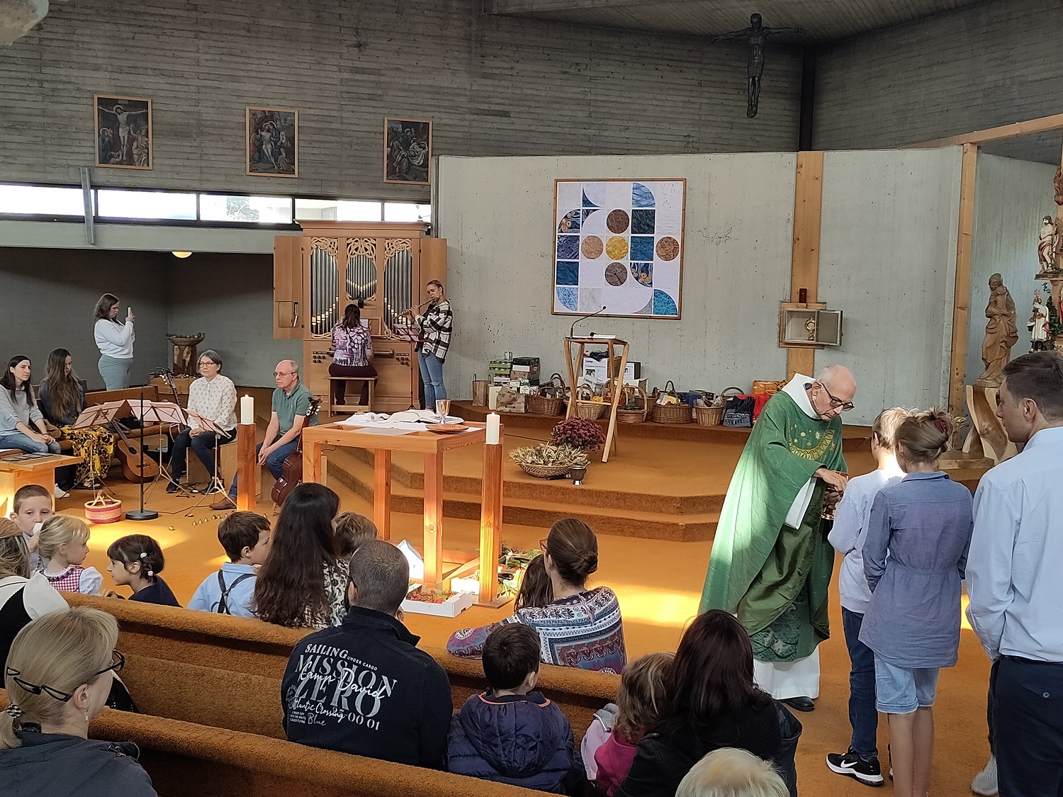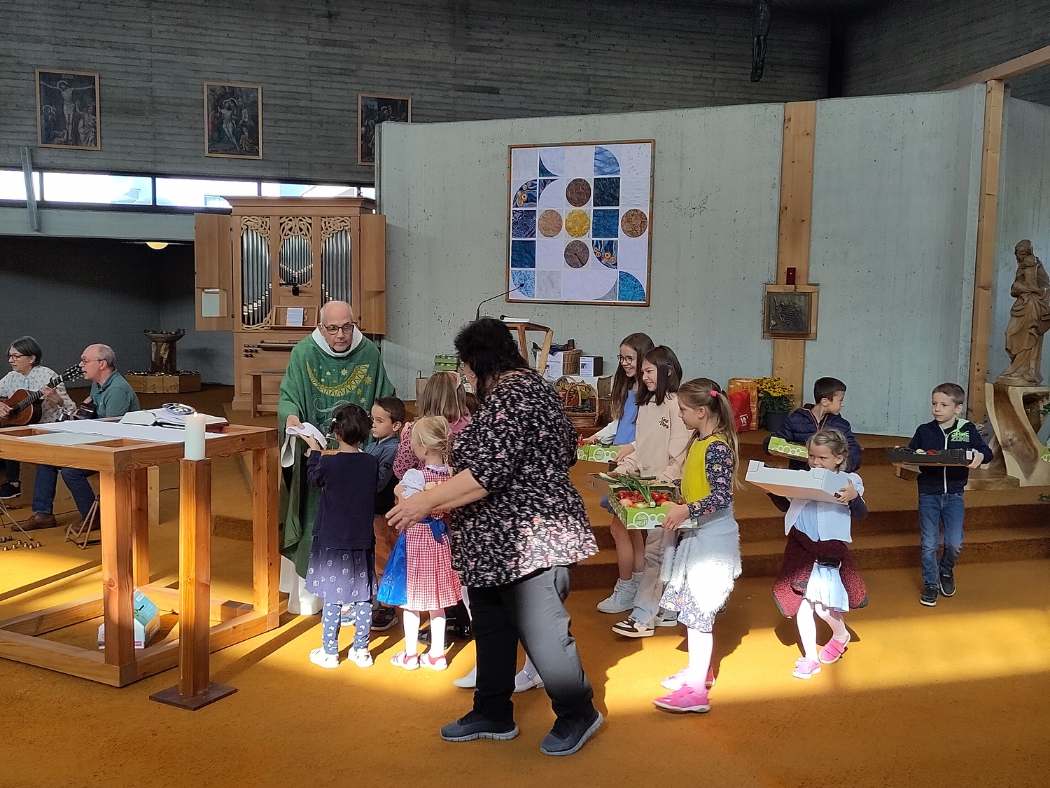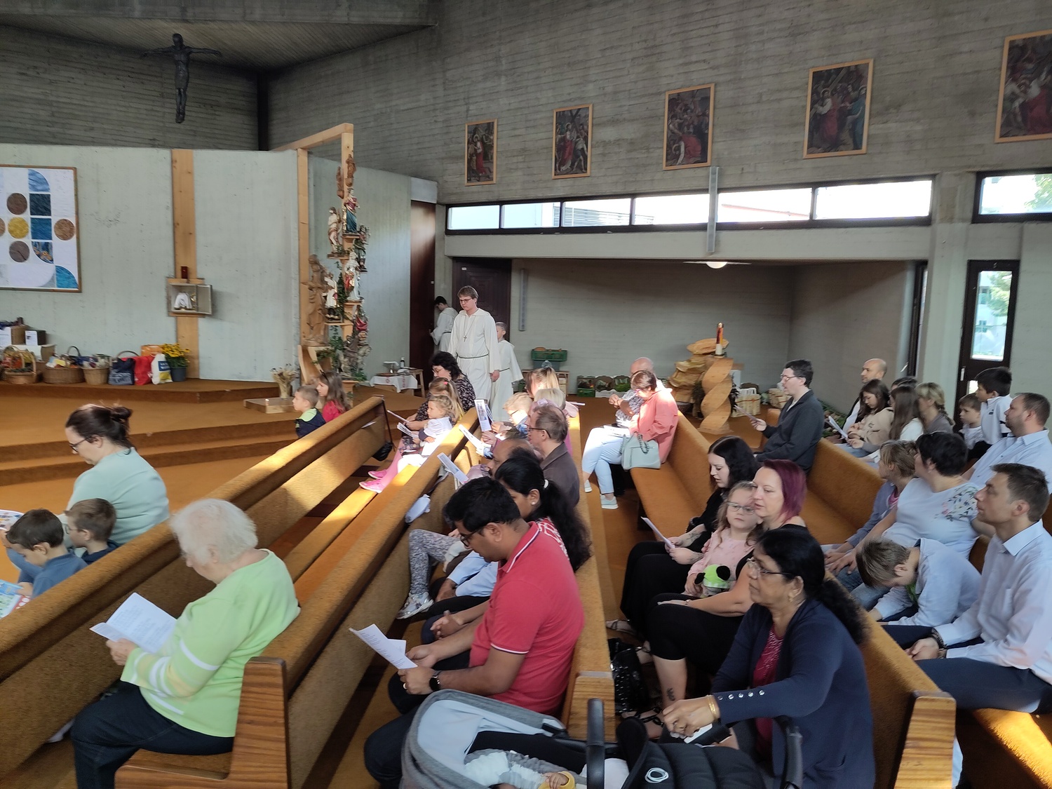 Pfarrer Krexner hat in der Hl. Messe die Kinder gefragt, was sie alles in der Kirche sehen können und wofür wir dankbar sein können. Obst und Gemüse wurde genannt, Freunde, das Wetter,… Wir können Jesus danken, indem wir hilfsbereit sind, anderen eine Freude machen. Ja einige Kinder gaben erstaunliche Antworten!!! Der Gottesdienst wurde musikalisch von Diakon Schalk und seiner Frau vorbereitet und gemeinsam mit Sabine und Vanessa Nowotny, Orgel und Querflöte, begleitet. Auch eine Posaune war dabei. Am Ende wurden alle Mitfeiernden, die Erntegaben und die Erntedankbüscherl gesegnet. Zwei, drei Kinder wollten sogar ganz besonders viel Segen, worauf sie Pfarrer Krexner mit einer Extraportion Weihwasser bedacht hat. Bei der anschließenden Agape gab es Grillwürstel, Salate, Kaffee und Kuchen. Und es sind sehr viele Gottesdienstbesucher zu Speis´ und Trank´ geblieben. Während der Agape fand auch eine Tombola statt, die Peter Kuras wie schon in den vergangenen Jahren geleitet hat. Hilfe hatte er von Glücksengerl Mira. Sie zog die Lose und die Gewinner konnten sich Ihre Kisterl oder Sackerl mit den Erntespenden abholen. Jedes Los hat gewonnen! Dank des schönen Wetters konnten die Kinder auf der Wiese spielen, bei Tisch wurde viel geplaudert und kennengelernt, alle waren gut gelaunt. Der Losverkauf, sowie Spenden für Essen und Getränke erbrachten 1.102,30 Euro, die pfarrlichen Projekten zugute kommen. Ein herzliches Vergelt´s Gott! Ebenfalls zum Erntedankfest führten wir die Caritas Erntedanksammlung für das Le+O Projekt durch. Dabei brachten die Kirchenbesucher insgesamt 244 kg haltbare Lebensmittel zum Altar: Zucker, Mehl, Salz, Öl, Kaffee, Reis, Konserven, Teigwaren, Süßigkeiten, Milch und Getränke. In zwei Autos eingeladen brachten Elisabeth Mroz und Andi Breunhölder die Waren am vergangenen Mittwoch zum Le+O Stützpunkt in die Pfarre Kaiserebersdorf. Wir bedanken uns bei allen, die so eifrig gespendet haben! Herzlichen Dank allen, die zum großartigen Gelingen beigetragen haben!