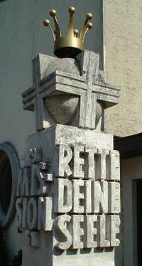 Die überlebensgroße Kreuzigungsgruppe über dem Haupteingang der Kirche ist ein Werk von Dipl.-Ing. Weinberger.
