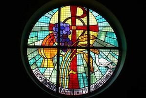 Die runden Fenster neben dem Haupteingang sind eine Arbeit des Glasmalers Franz Götzer und wurden von der Familie Wallisch-Hecht und den Schwestern M. und Th. Soukup gespendet.