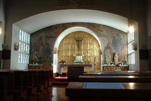Wir betreten den Kirchenraum. Bereits auf den ersten Blick nimmt uns die vergoldete Kunststein-Altarwand gefangen, mit einer Hochreliefszene aus dem Leben des Hl. Josef (Kirchenpatron) und des Hl. Franziskus (Ordenspatron) von Prof. Heinrich Tahedl.