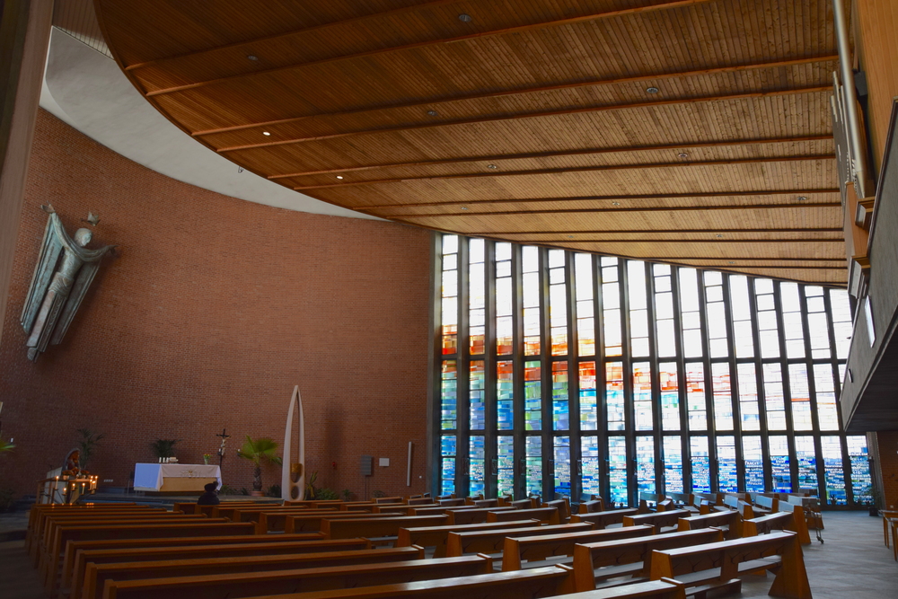 Wer das Dach unserer Kirche genauer betrachtet, wird schnell bemerken, dass es in Zeltform gestaltet ist – es spannt sich wie ein ansteigendes Segel über den Kirchenraum. Der Architekt wurde dabei von einem Bibelzitat inspiriert, das in der Offenbarung des Johannes (21,3) nachzulesen ist: „Siehe das Zelt Gottes unter den Menschen“.