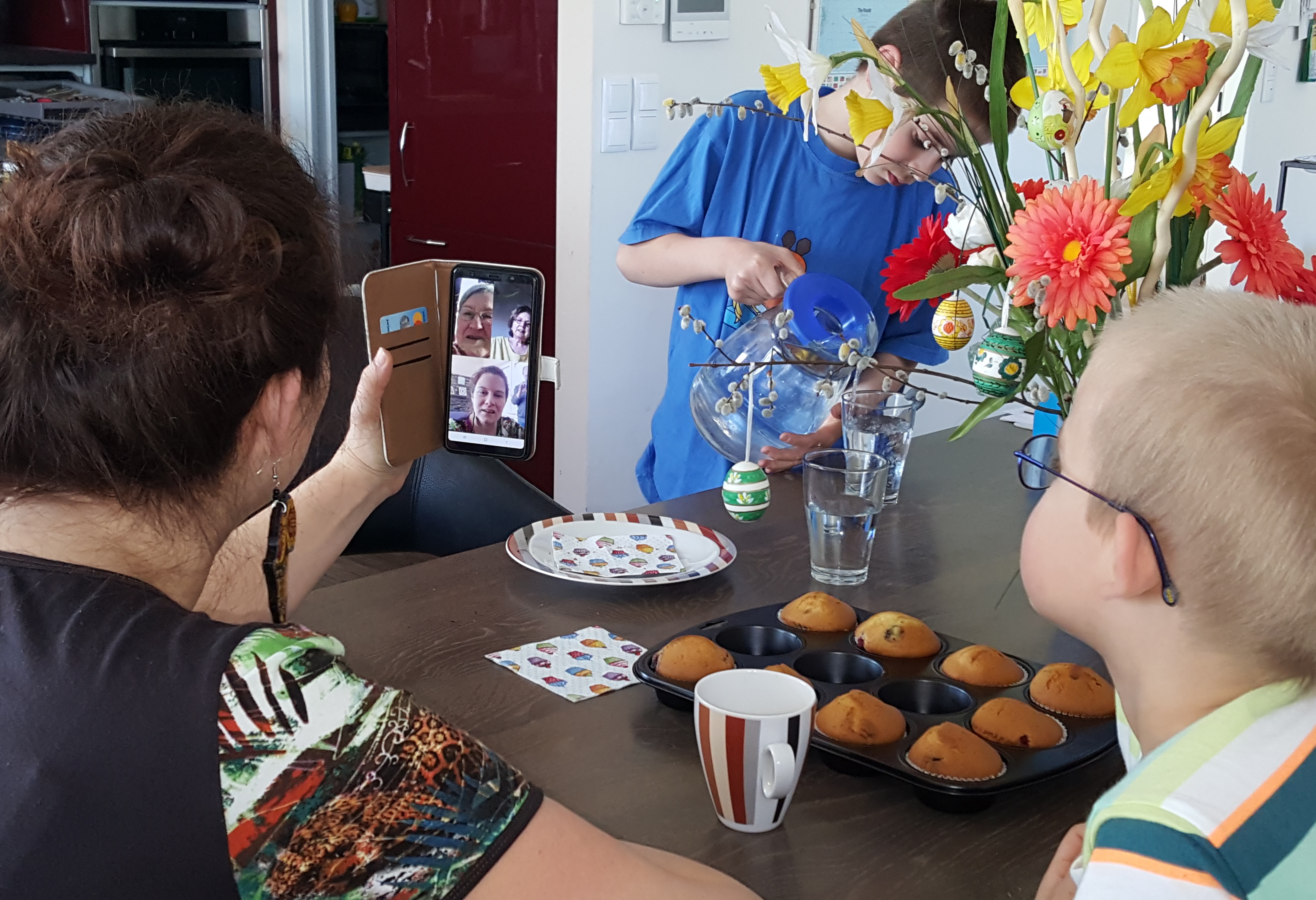"Der „Eva-Tisch“ hat sich per WhatsApp Video-Anruf getroffen und wir hatten es eine gute Stunde sehr lustig! Wir haben mit Evchen Palmzweige geteilt, einander keinen Kaffee wegtrunken und gemeinsam gelacht. Technisch hat es recht gut geklappt. Mehr als 3 Personen sollten es für WhatsApp nicht sein – am Handy ist es doch dann eher zu klein zum einander Sehen und es gibt doch immer eine gewisse Verzögerung und Hintergrundrauschen, aber für heute hat das total gepasst. Eva, Evchen und Evi waren happy J