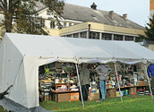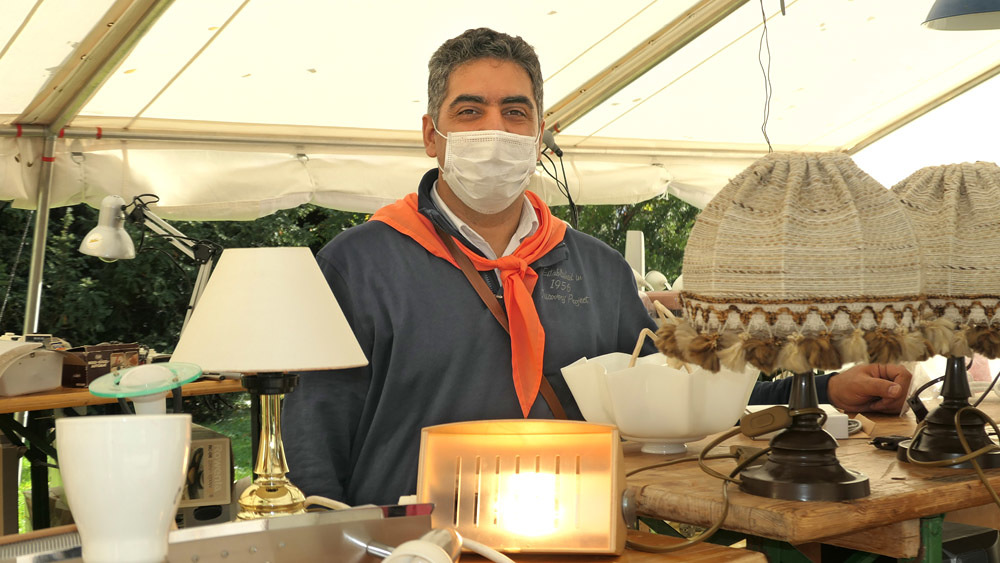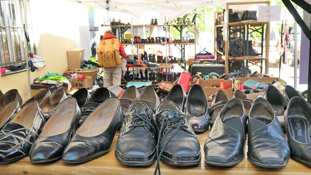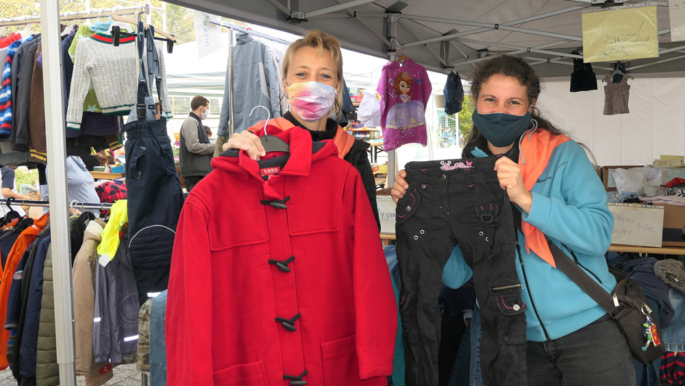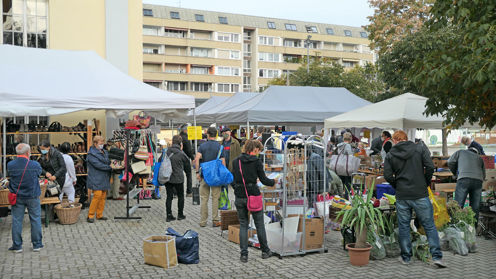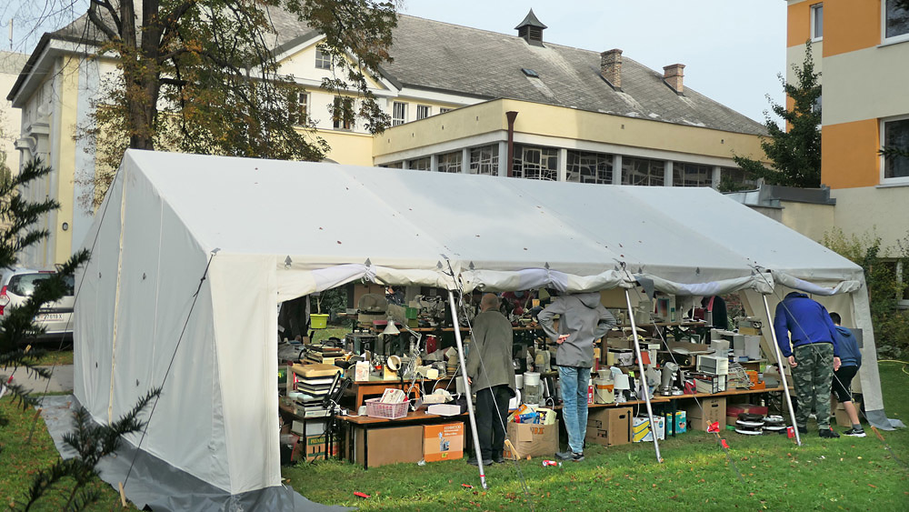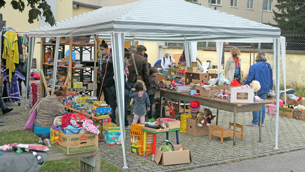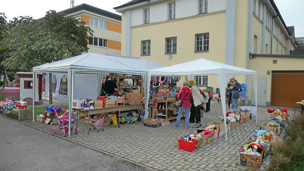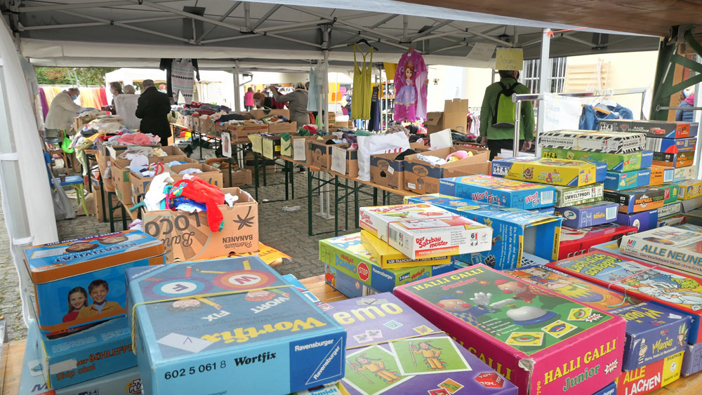 Diesmal war besonders der Ideenreichtum und die Einsatzfreude vieler Gruppen und Privatpersonengefragt! So wurde zusätzlich zum Angebot im Pfarrhaus auch draußen im Freien - unter dem Schutz zahlreicher Zelte und der geforderten Hygienemaßnahmen - technische Geräte, Geschirr, Kleidung, Schmuck und Spielwaren aller Art angeboten. Sogar der Kirchenraum wurde ausnahmsweise als Verkaufsraum genützt, und so mancher genoss es in der Kirchenbank sitzend in Büchern zu schmökern und der Orgelmusik zu lauschen! Draußen ging es weit lebendiger zu, wenn gutes Gebrauchtes günstig über den Ladentisch wanderte, selbstverständlich für einen guten Zweck und oftmals verbunden mit einer kleinen Plauderei. Dazu durfte nach den vielen erstandenen Schnäppchen ein Kaffee und einer der vielen selbstgemachten Kuchen und belegten Brote nicht fehlen!