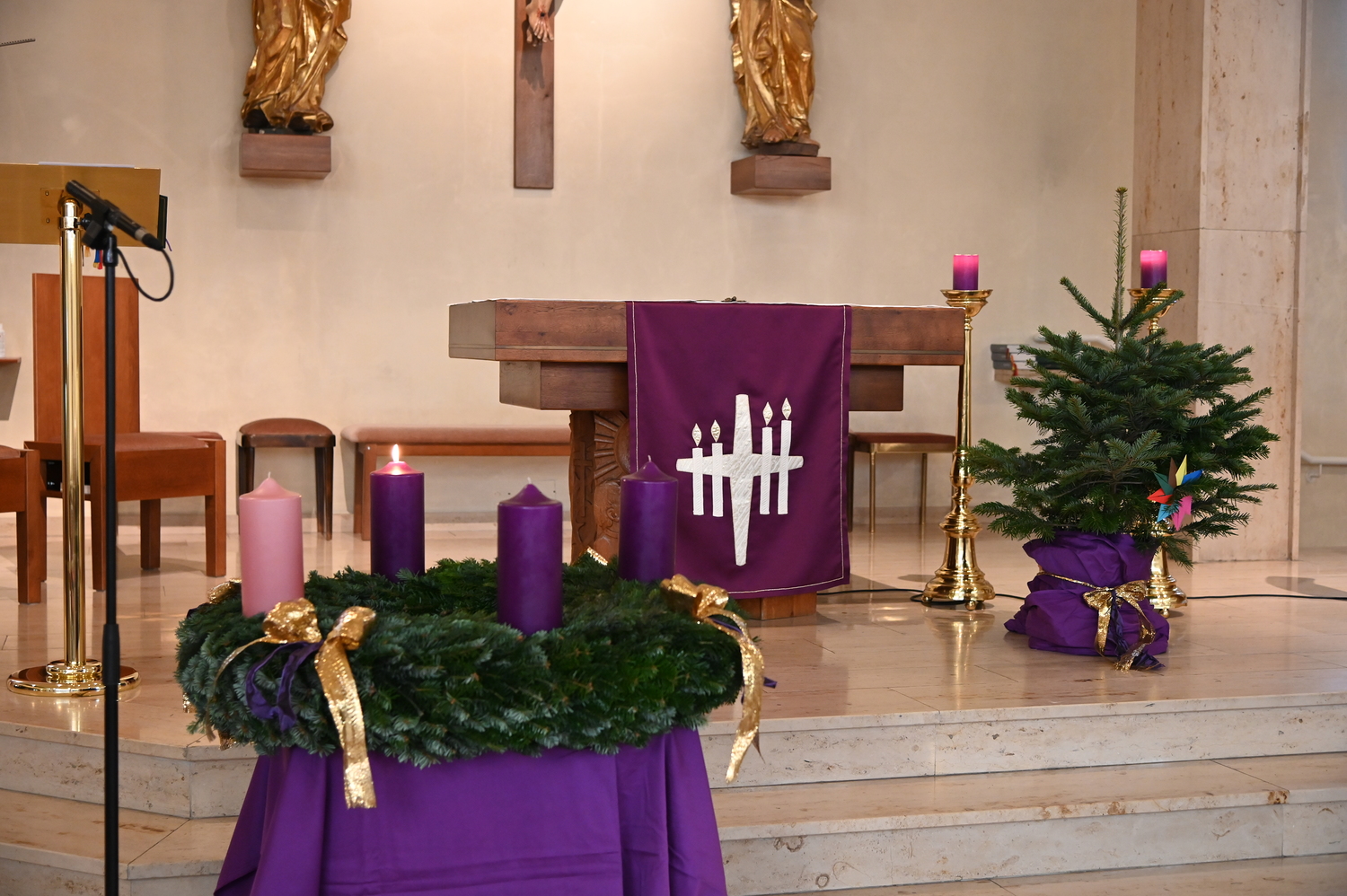Wir werden jeden Sonntag einen neuen Stern auf den kleinen, lebenden Weihnachtsbaum vor dem Altar hängen. Auch auf der Säule sieht man den jeweiligen Stern und das Thema des Adventsonntags.
