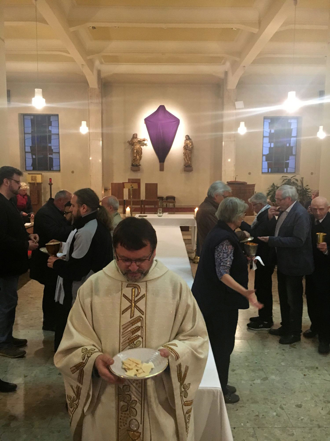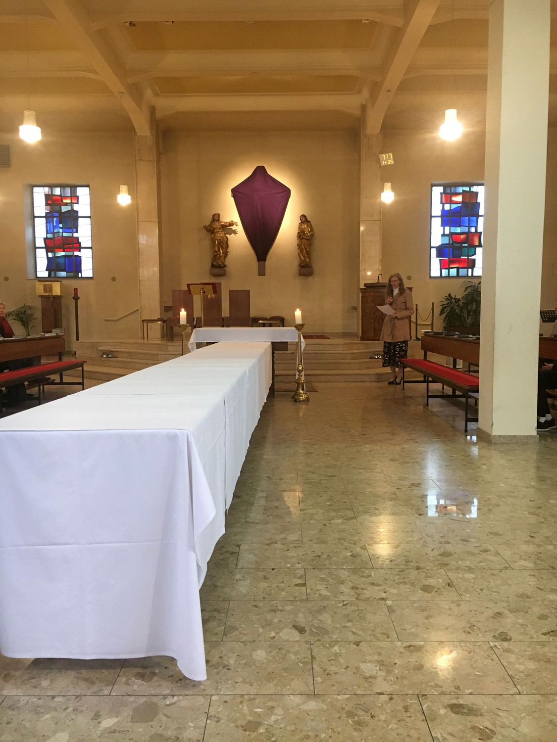 Die große Tafel in der Mitte der Kirche machte uns bewusst, worum es eigentlich bei jeder Eucharistiefeier geht: Wir sind versammelt zu einer großen festlichen Tischgemeinschaft.