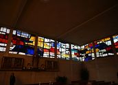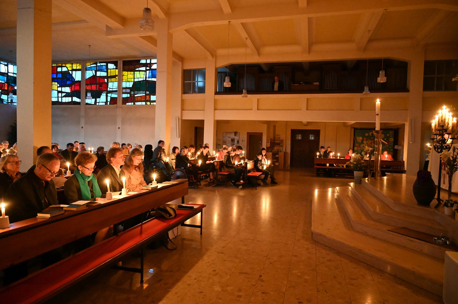 Langsam erhellte die aufgehende Sonne den Kirchenraum durch die bunten Glasfenster vom Tabernakel über die Osterkerze bis zum Altar.