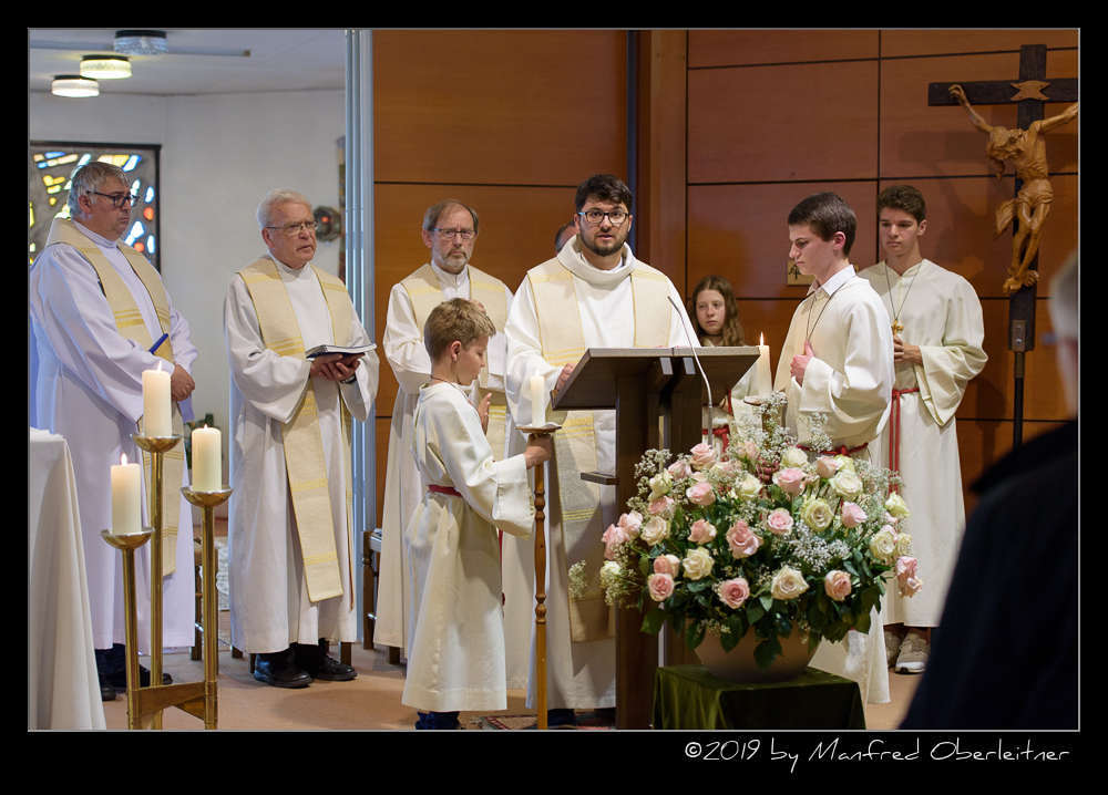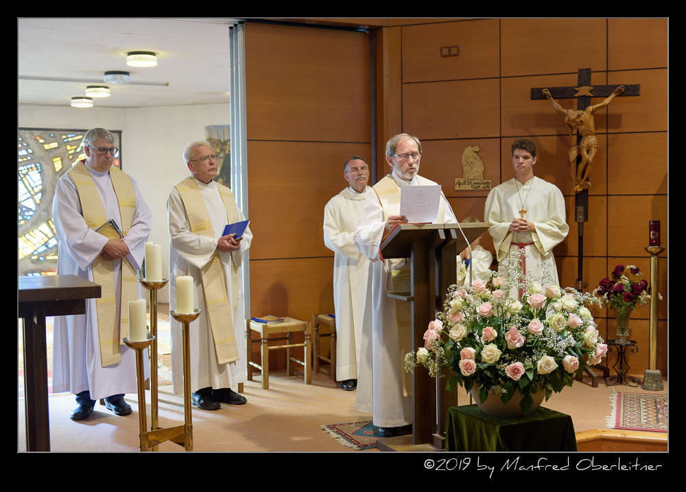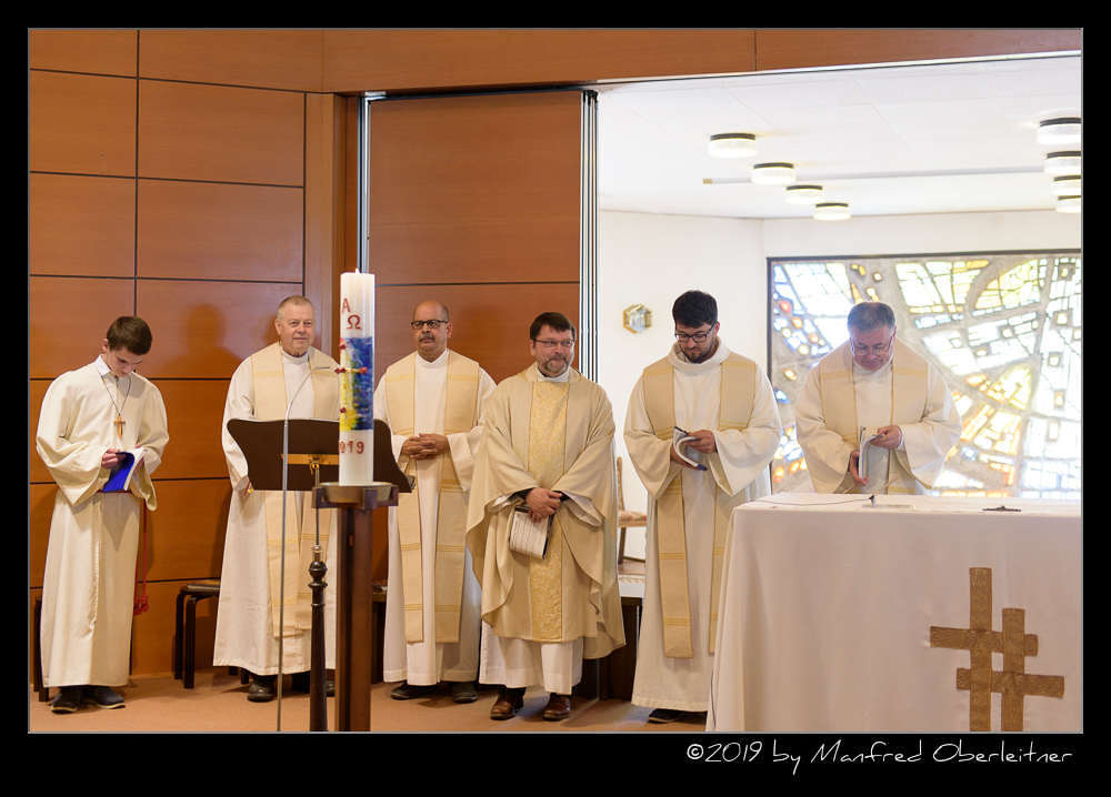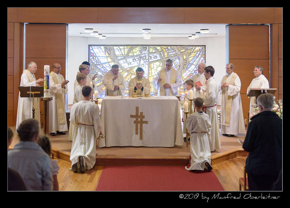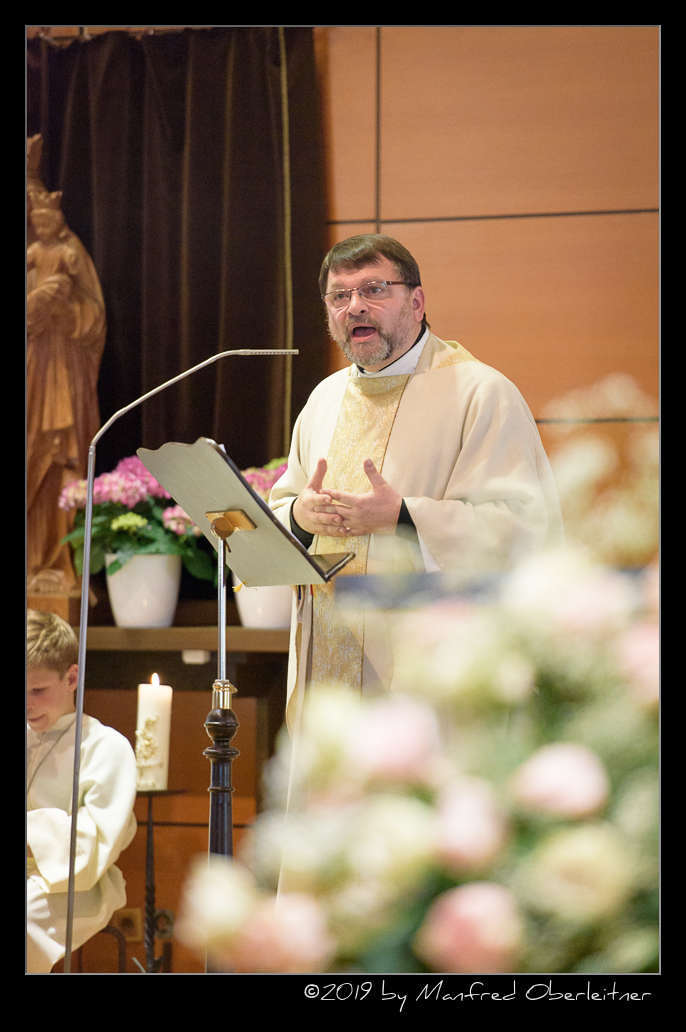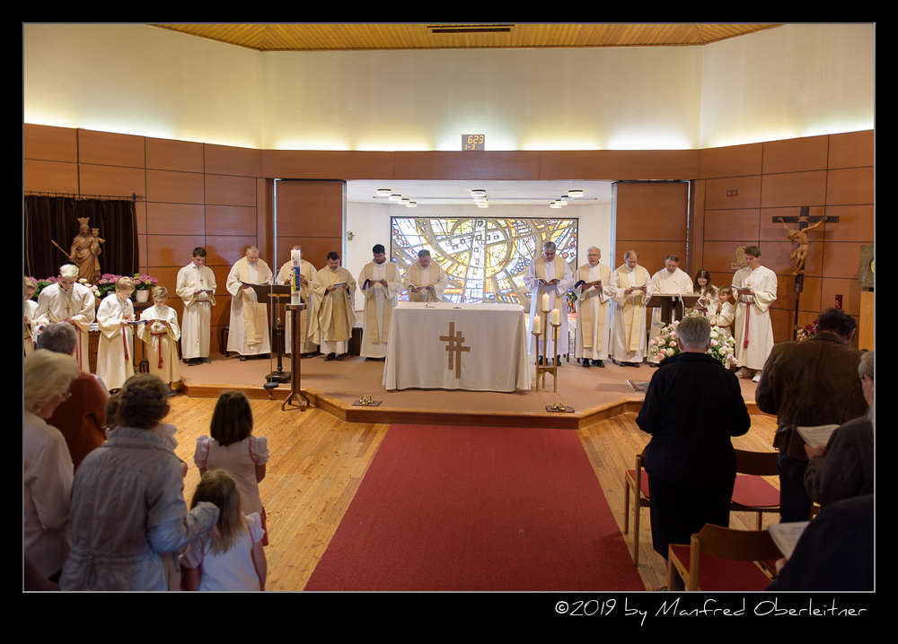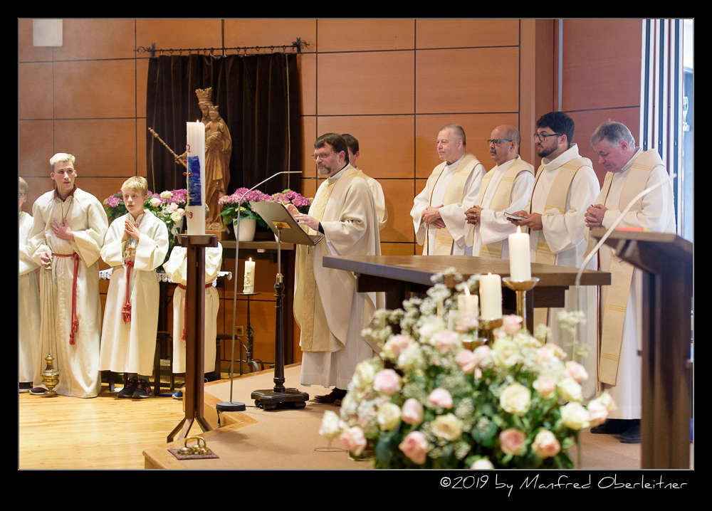 Die feierliche Messe begann mit dem Einzug von sieben Priestern, einem Diakon und mehreren Ministranten. Darunter waren P. Hermann Sandberger und P. Hans Schwarzl, die beide eine lange Zeit als Kapläne das Gemeindeleben in dieser katholischen Kirche prägten.