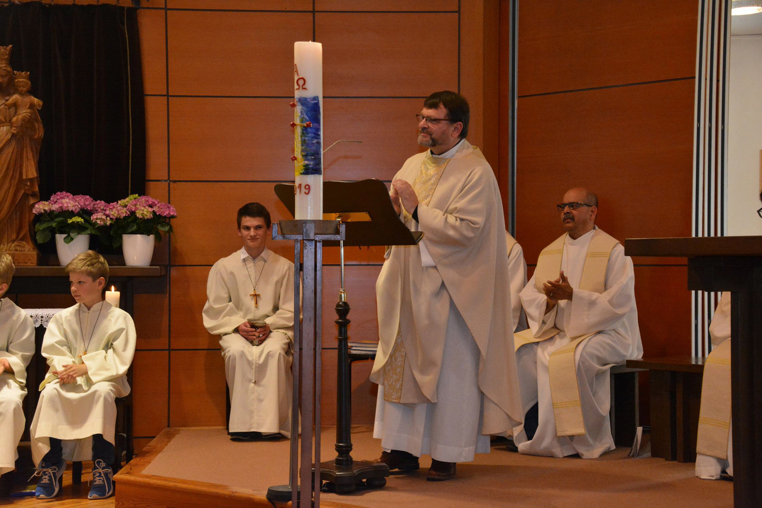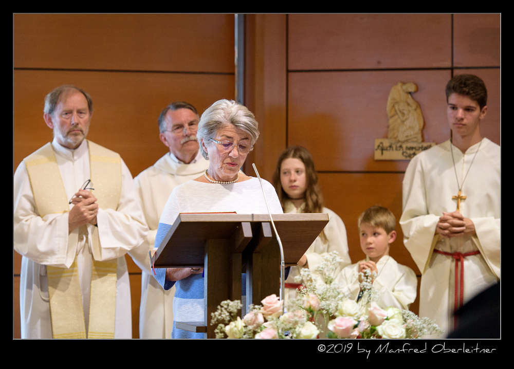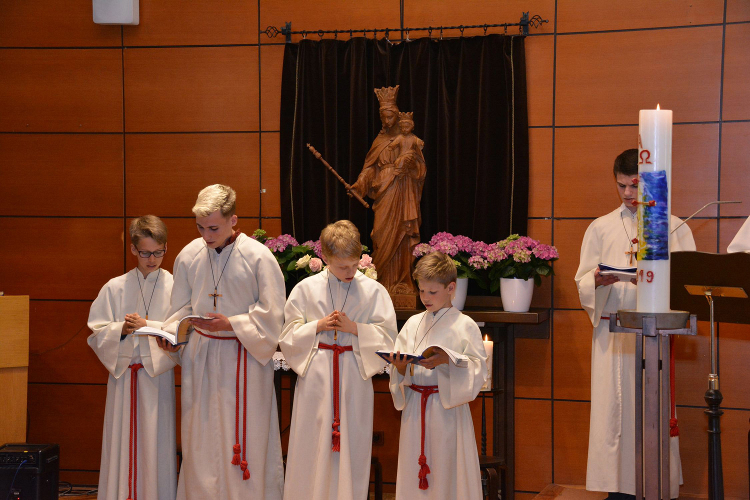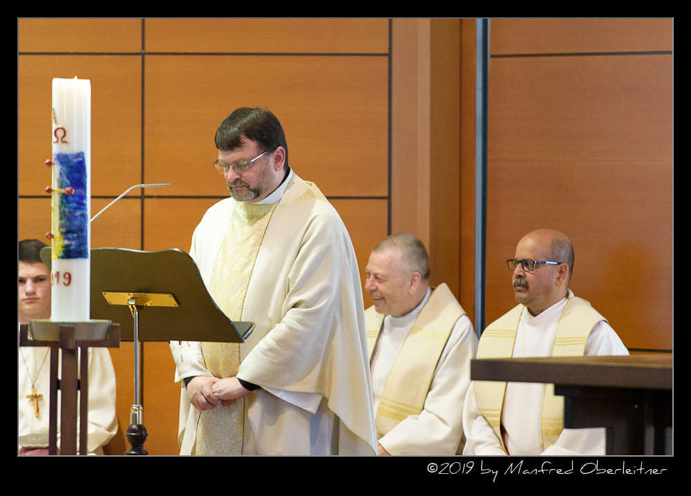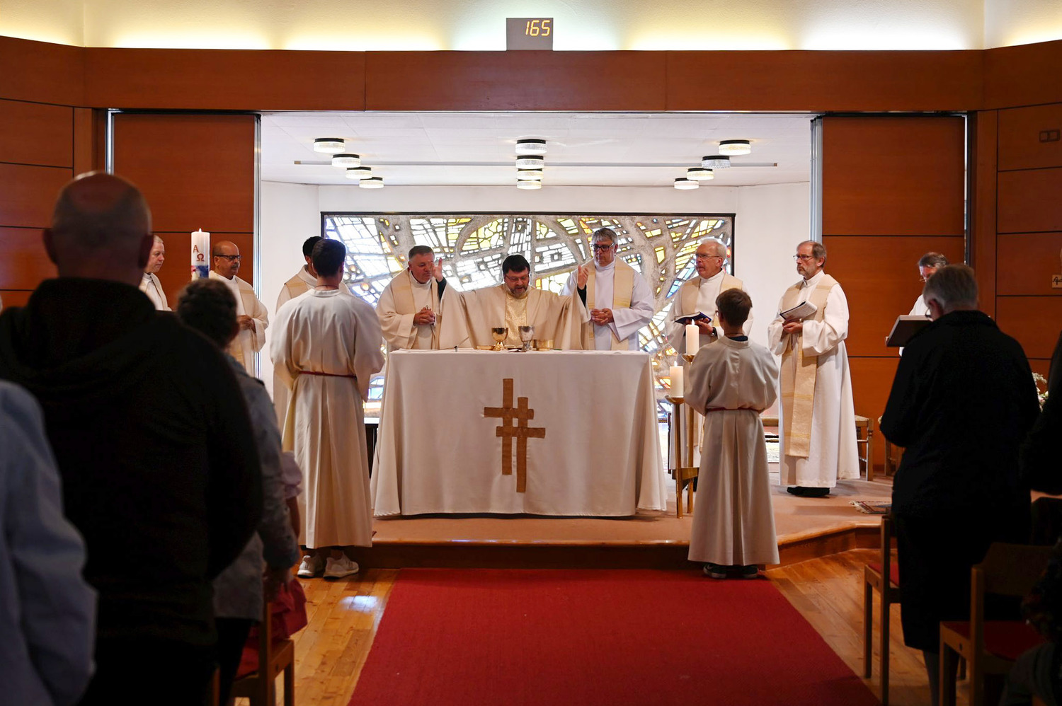 Die feierliche Messe begann mit dem Einzug von sieben Priestern, einem Diakon und mehreren Ministranten. Darunter waren P. Hermann Sandberger und P. Hans Schwarzl, die beide eine lange Zeit als Kapläne das Gemeindeleben in dieser katholischen Kirche prägten.