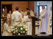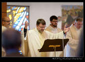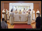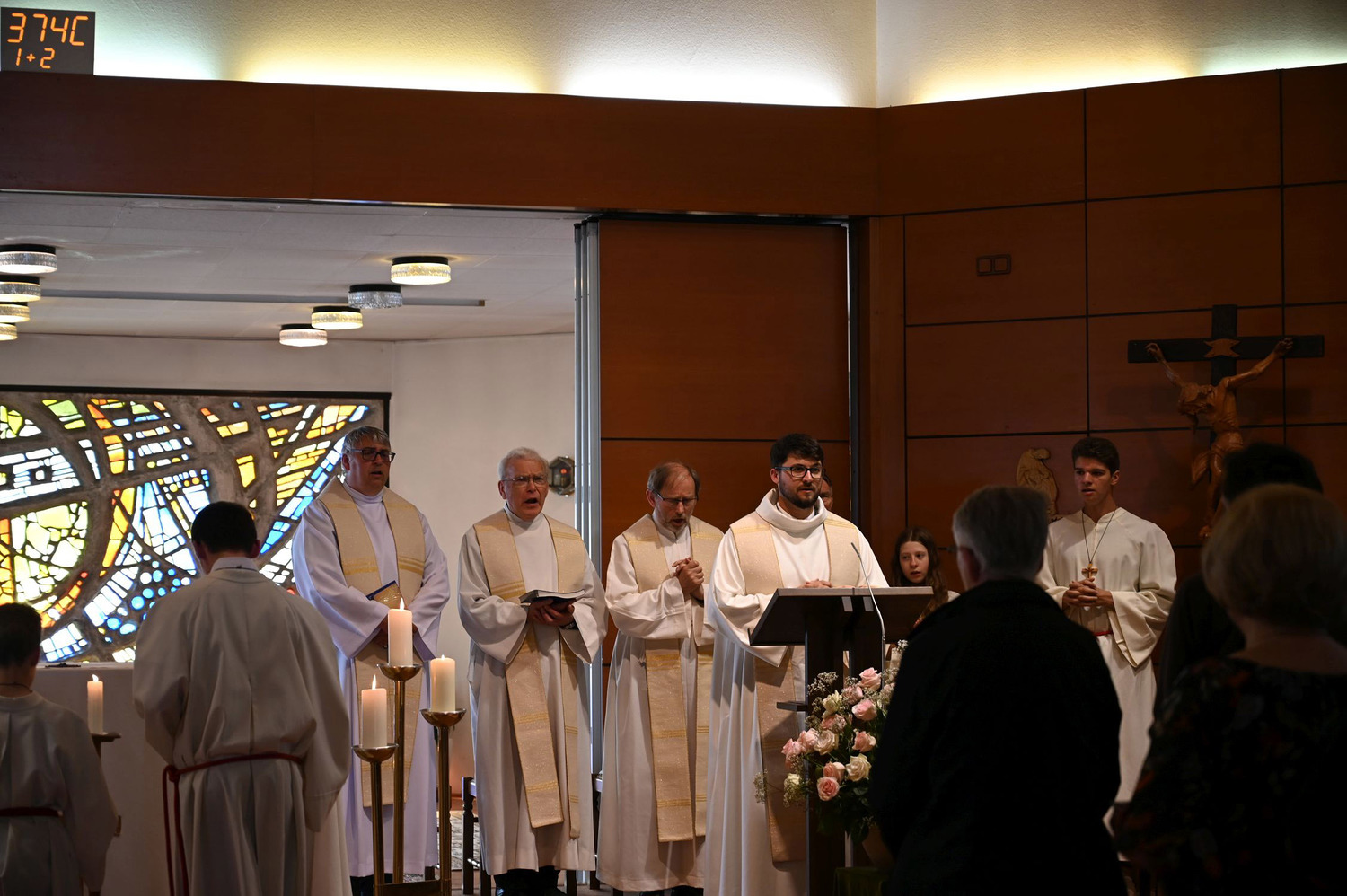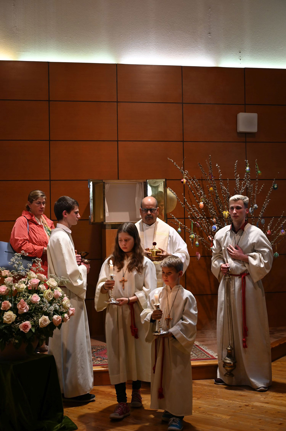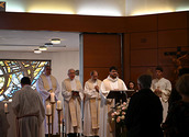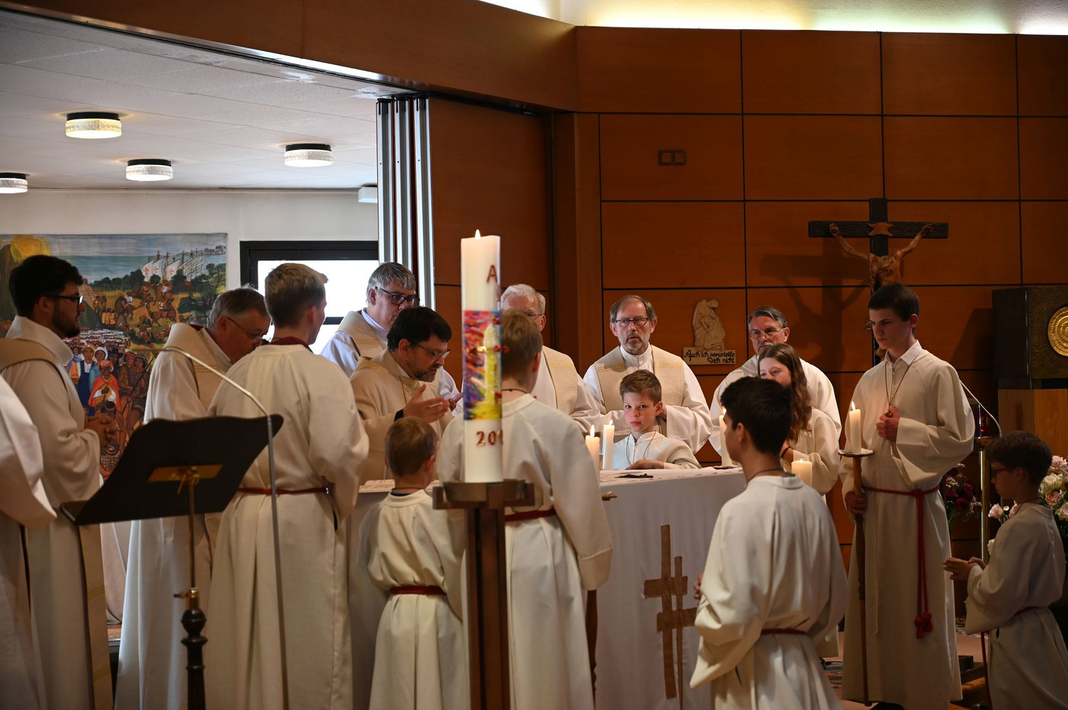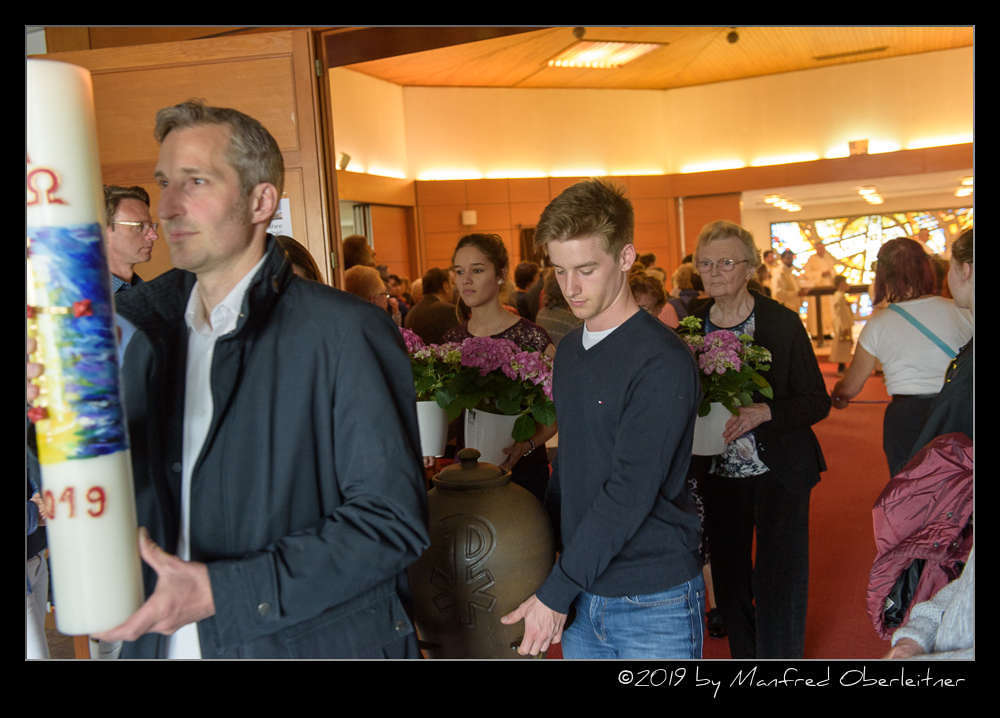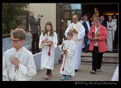 Die feierliche Messe begann mit dem Einzug von sieben Priestern, einem Diakon und mehreren Ministranten. Darunter waren P. Hermann Sandberger und P. Hans Schwarzl, die beide eine lange Zeit als Kapläne das Gemeindeleben in dieser katholischen Kirche prägten.