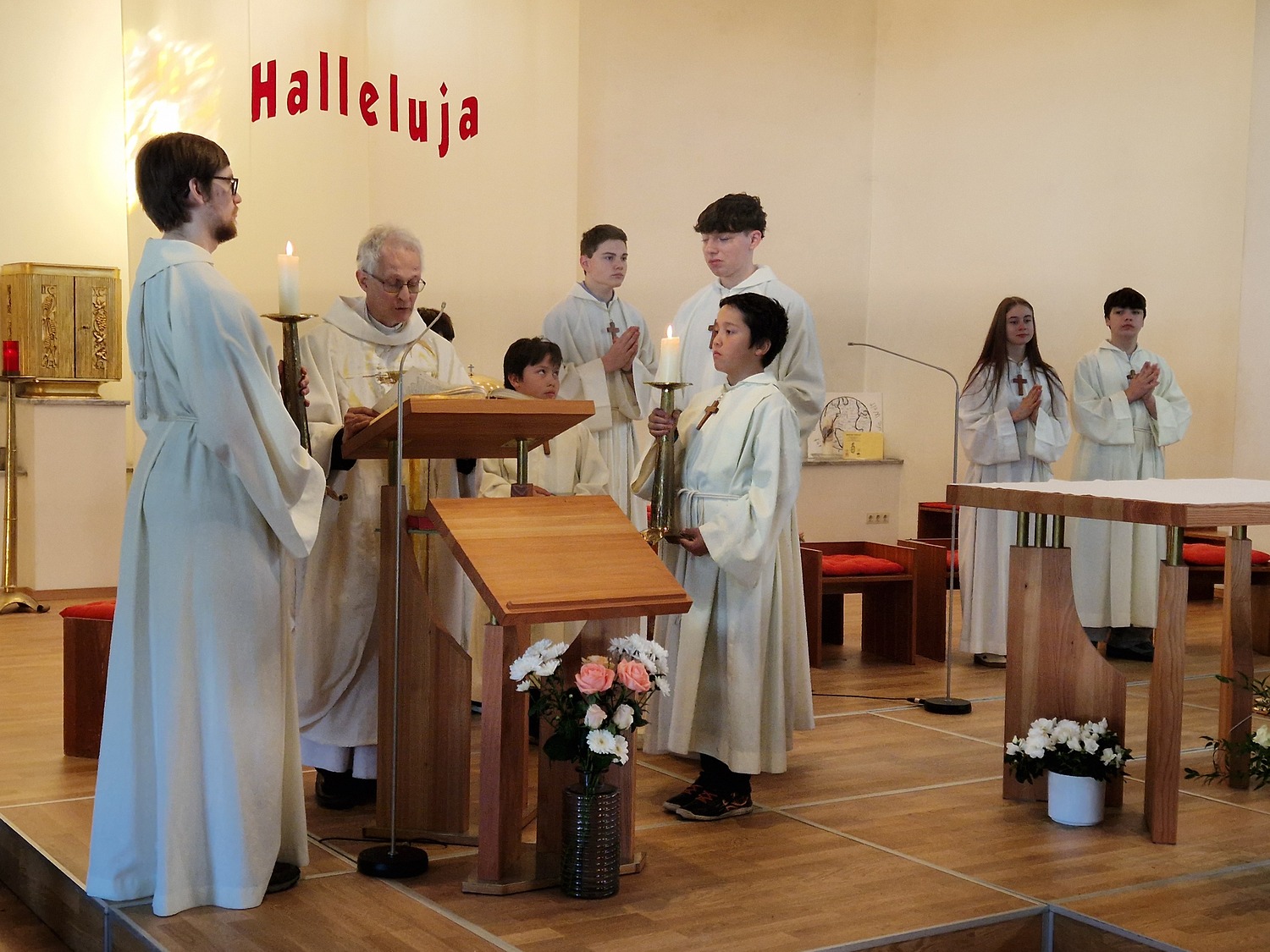 Nach der Lichtfeier beim Osterfeuer vor der Kirche, hörten wir in der Kirche die alttestamentlichen Lesungen, nach dem Gloria die Epistel aus dem neuen Testament und das Evangelium von der Auferstehung Jesu: Halleluja, Jesus lebt. (Alle Fotos siehe Bildergalerie 2026)