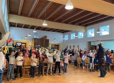 "Jesus lebt, Jesus lebt, alle Menschen sollen wissen Jesus lebt" singen über 100 Volkschulkinder in der Osterschulmesse der VS Rodaun.