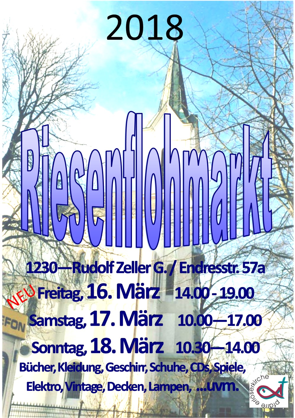 Ein Pfarrflohmarkt von der feinen Sorte: alle gut sortiert, geputzt und aufgestellt ...unser Team wartet auf den Ansturm um sämtliche Bücher, CDs, Spiele, Geschhirr, Gewand, Schuhe, Taschen, Bilder, Schmuck ...uvm ... und natürlch handgemachte Torten und Kuchen an den Mann/an die Frau zu bringen...