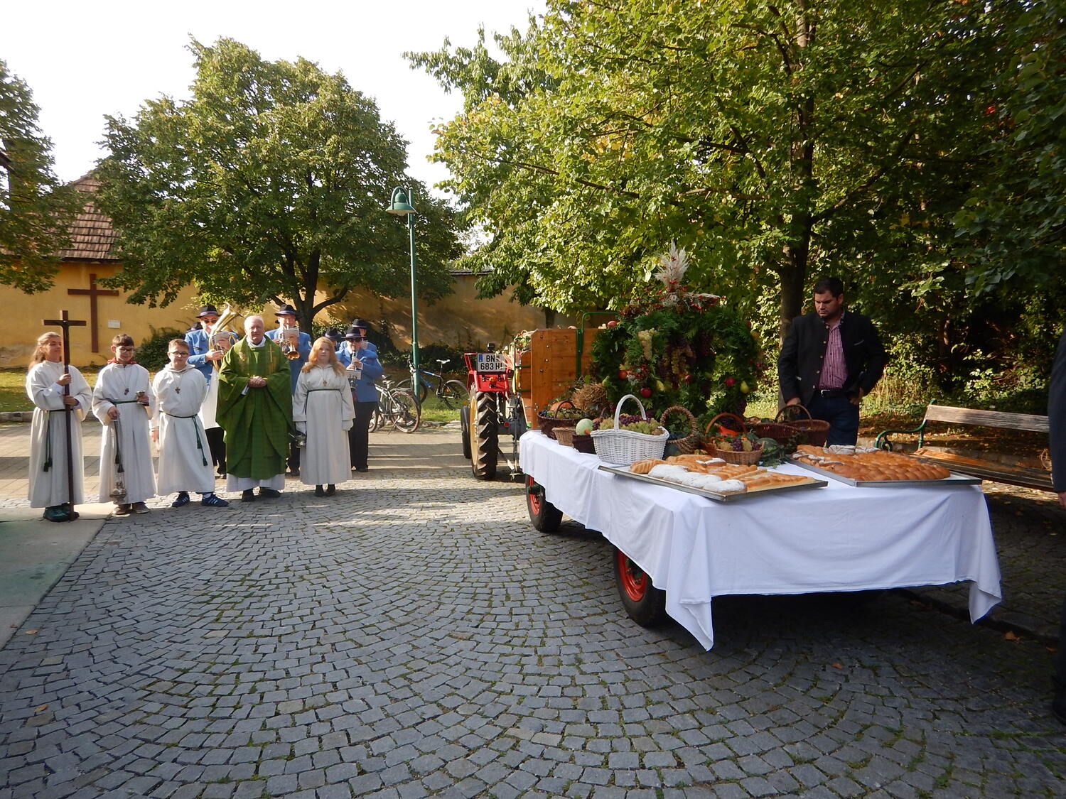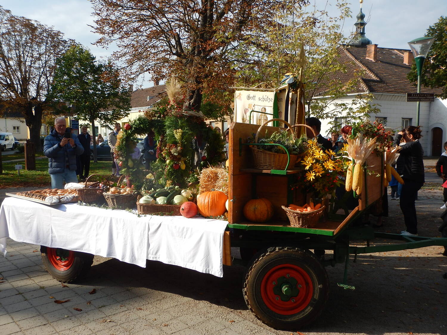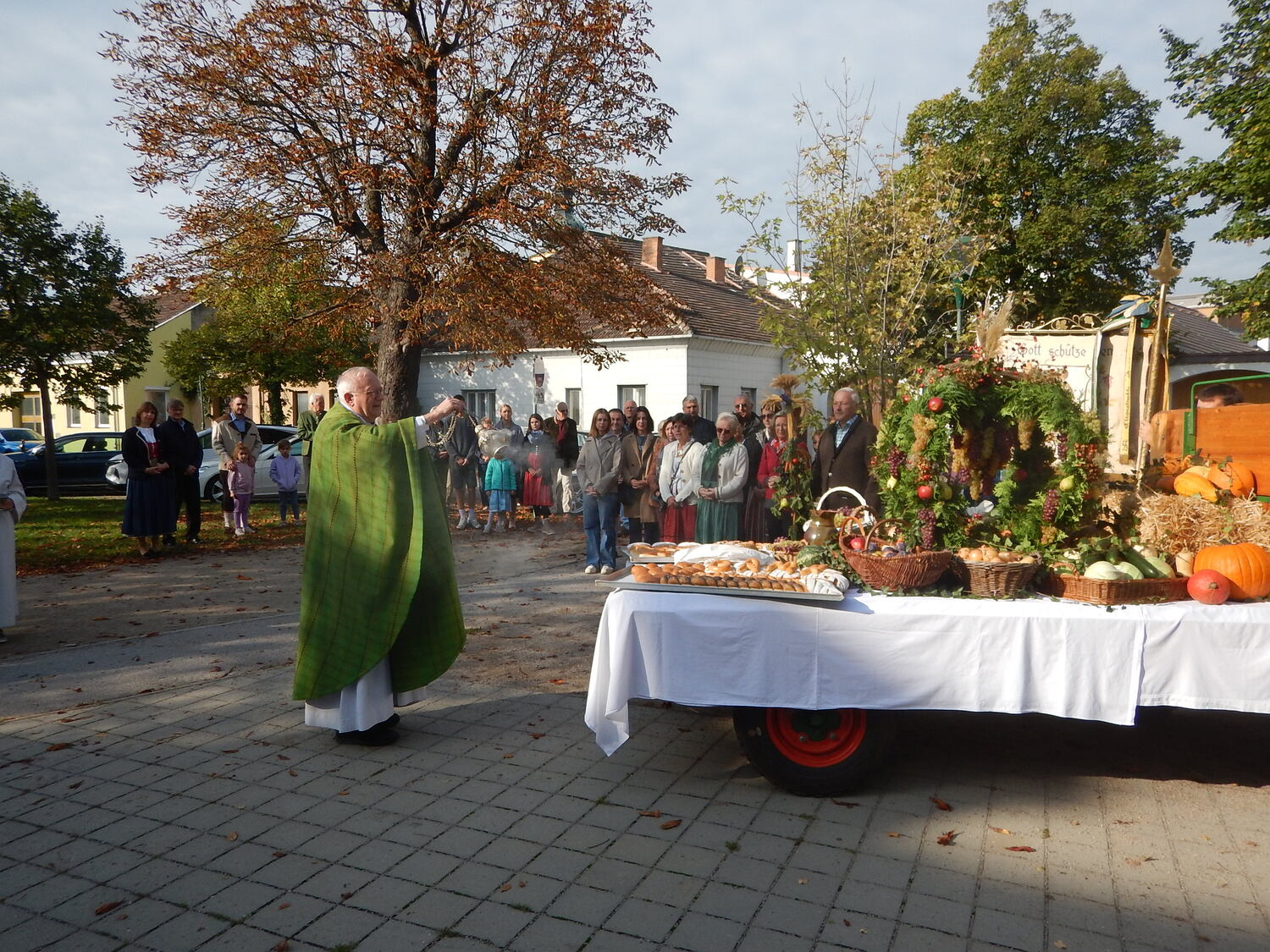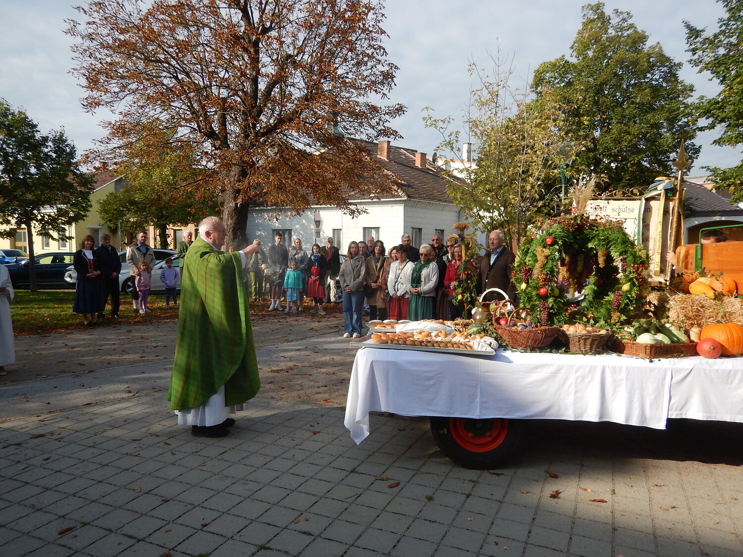 Die Winzerinnen unseres Ortes schmückten die Erntekrone und den Wagen wunderschön mit Obst, Gemüse, Brot und Wein. Am Hauptplatz wurde die Krone feierlich gesegnet und in Prozession zur Kirche gebracht, musikalisch begleitet vom Musikverein. In der Kirche wurde der Dankgottesdienst gefeiert, mit musikalische Unterstützung vom Kirchenchor und der Kinderband. In seiner Predigt dankte Pater Walter alle Mitglieder unserer Pfarre für ihre große Unterstützung bei allen pfarrlichen Sammelaktionen für Caritas, Missio, Mary´s Meals,... Neben dem materiellen Bedürfnisse unserer Mitmenschen nah und fern sollten wir aber auch nicht die Not an Liebe, Anerkennung, Aufmerksamkeit, Trost,... übersehen. Wir können danken für die reiche Ernte in der Natur, aber dürfen auch danken für die Liebe die uns geschenkt wird.